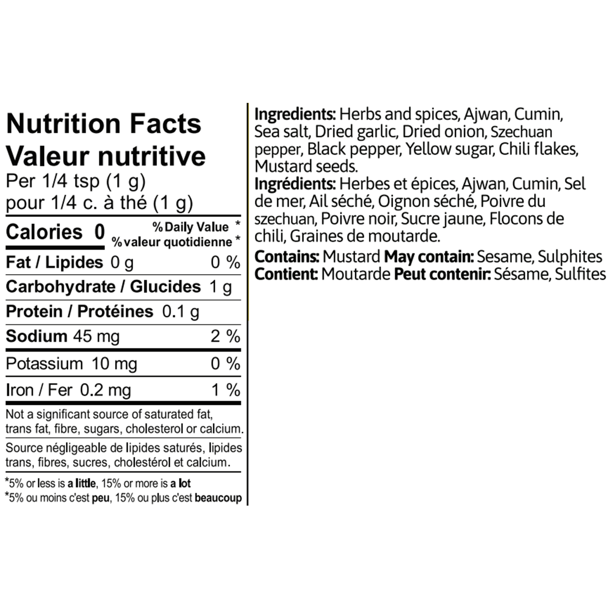 Herbs and spices, Ajwan, Cumin, Sea salt, Dried garlic, Dried onion, Szechuan pepper, Black pepper, Yellow sugar, Chili flakes, Mustard seeds.