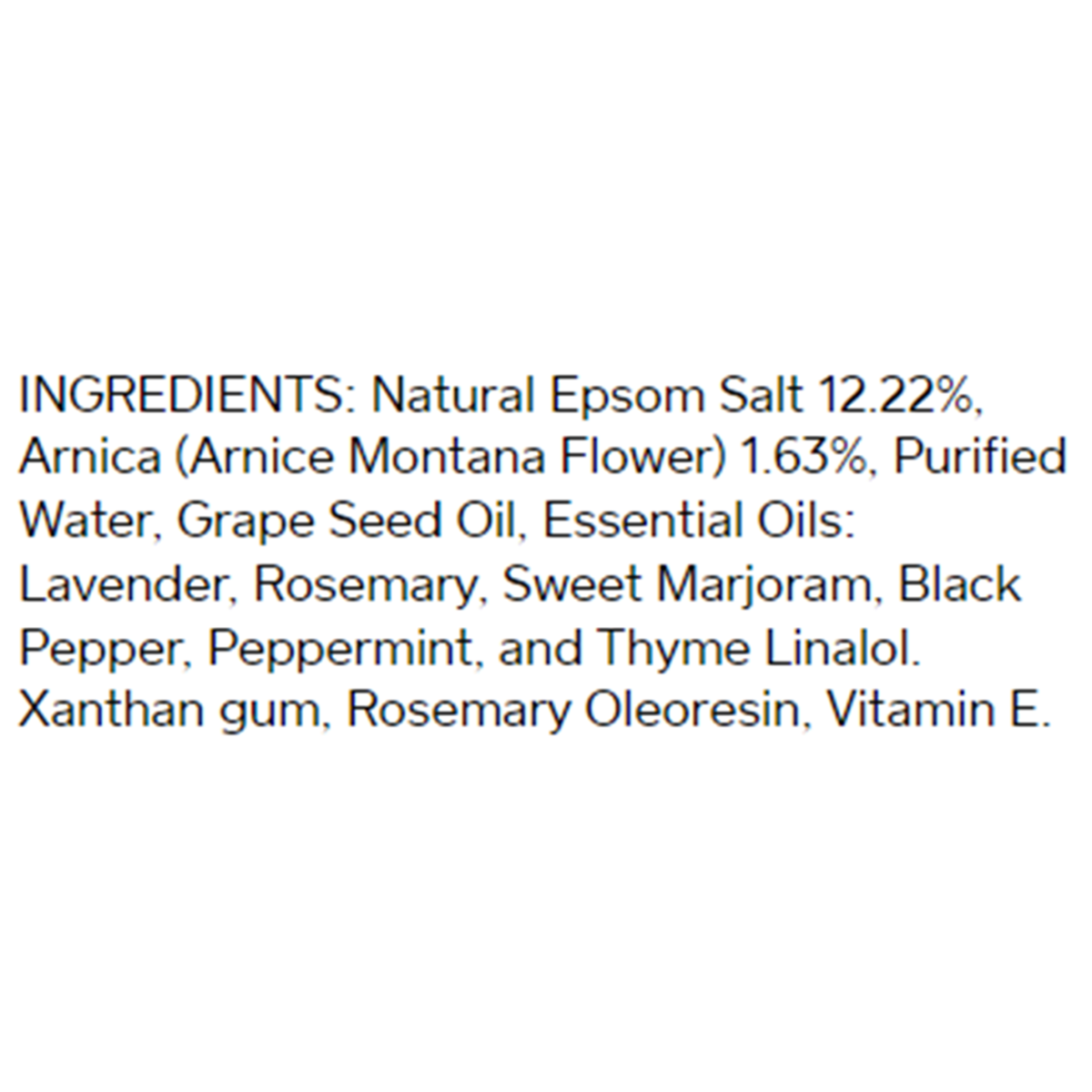 Natural Epsom Salt 12.22%, Arnica (Arnice Montana Flower) 1.63%, Purified Water, Grape Seed Oil, Essential Oils: Lavender, Rosemary, Sweet Marjoram, Black Pepper, Peppermint, and Thyme Linalol. Xanthan gum, Rosemary Oleoresin, Vitamin E.