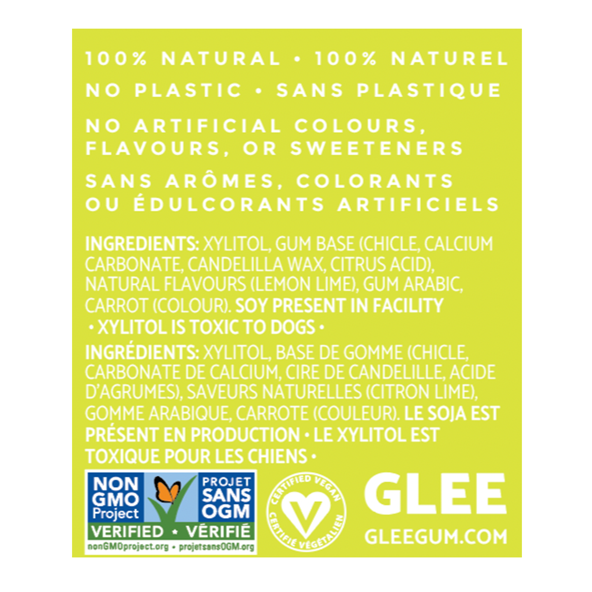 Xylitol, Gum Base (Chicle, Calcium Carbonate, Candelilla Wax, Citrus Acid), Natural Flavours (Lemon Lime), Gum Arabic, Carrot (Colour). Soy Present In Facility Xylitol Is Toxic To Dogs.