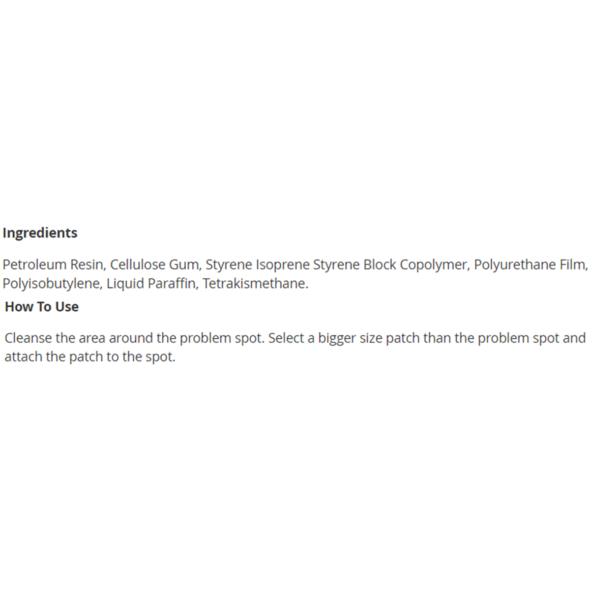 Petroleum Resin, Cellulose Gum, Styrene Isoprene Styrene Block Copolymer, Polyurethane Film, Polyisobutylene, Liquid Paraffin, Tetrakismethane.