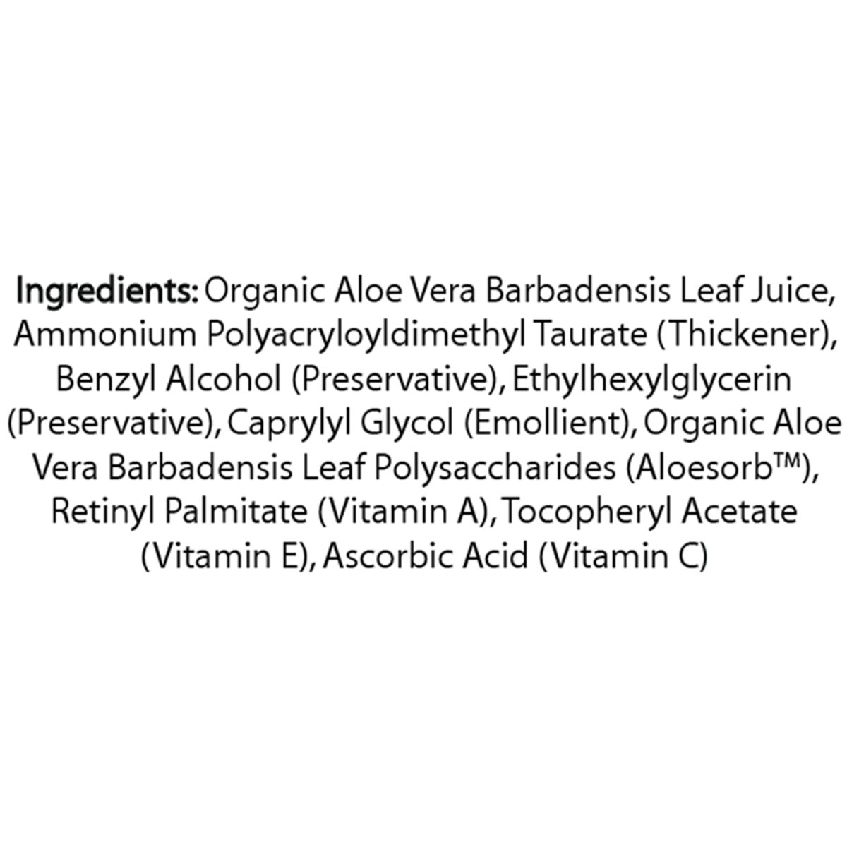 Organic Aloe Vera Barbadensis Leaf Juice, Ammonium Polyacryloyldimethyl Taurate (Thickener), Benzyl Alcohol (Preservative), Ethylhexylglycerin (Preservative), Caprylyl Glycol (Emollient), Organic Aloe Vera Barbadensis Leaf Polysaccharides (Aloesorb™M), Retinyl Palmitate (Vitamin A), Tocopheryl Acetate (Vitamin E), Ascorbic Acid (Vitamin C).