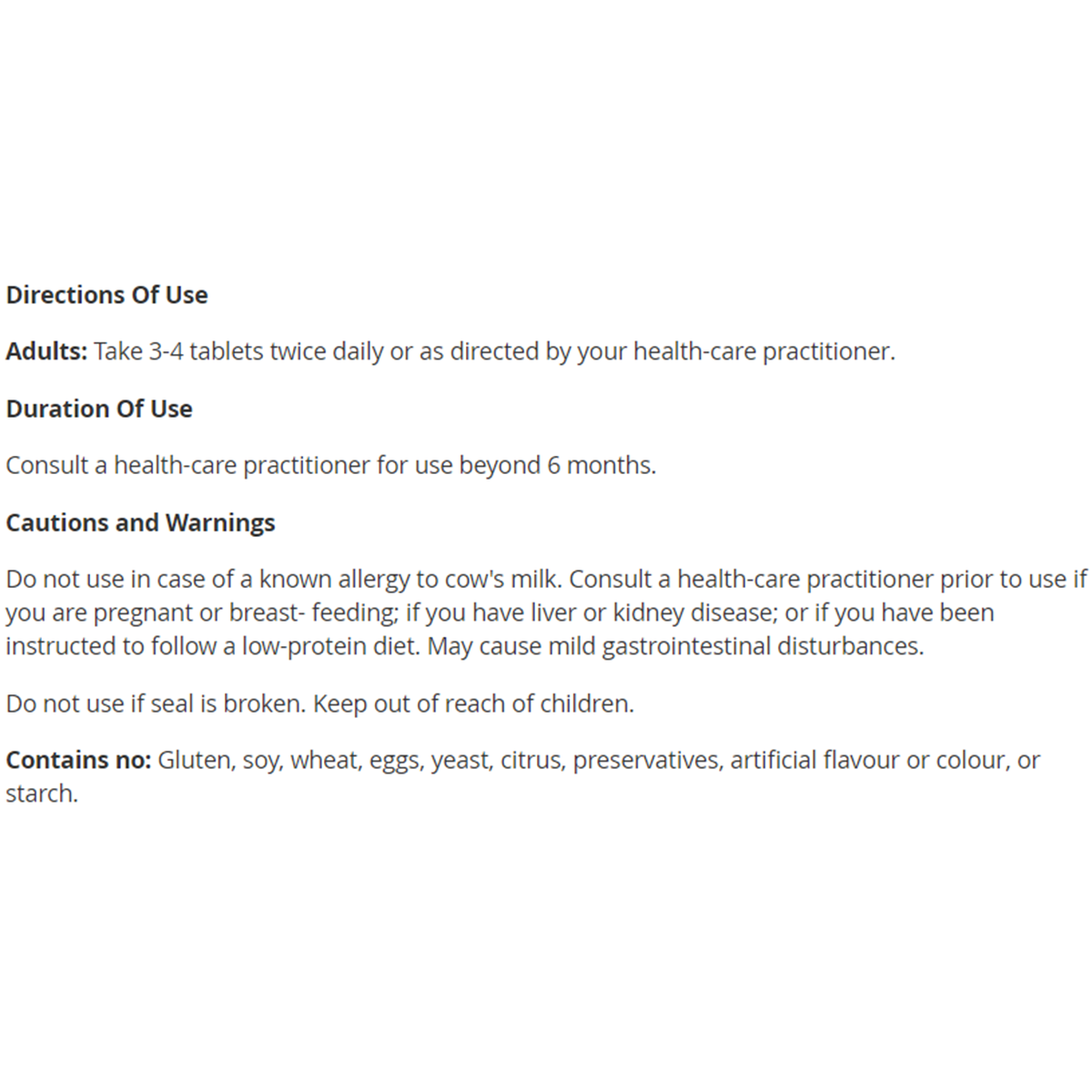 Do not use in case of a known allergy to cow's milk. Consult a health-wellness-care practitioner prior to use if you are pregnant or breast- feeding; if you have liver or kidney disease; or if you have been instructed to follow a low-protein Nutrition Plan. May cause mild gastrointestinal disturbances.
