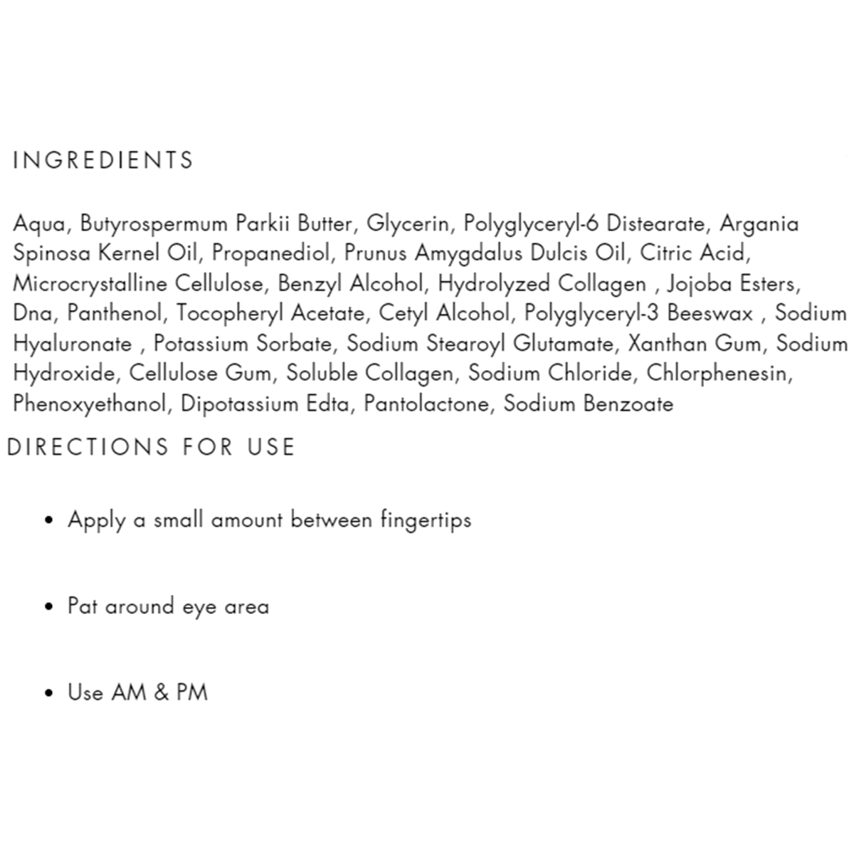 Aqua, Butyrospermum Parkii Butter, Glycerin, Polyglyceryl-6 Distearate, Argania Spinosa Kernel Oil, Propanediol, Prunus Amygdalus Dulcis Oil, Citric Acid, Microcrystalline Cellulose, Benzyl Alcohol, Hydrolyzed Collagen , Jojoba Esters, Dna, Panthenol, Tocopheryl Acetate, Cetyl Alcohol, Polyglyceryl-3 Beeswax , Sodium Hyaluronate , Potassium Sorbate, Sodium Stearoyl Glutamate, Xanthan Gum, Sodium Hydroxide, Cellulose Gum, Soluble Collagen, Sodium Chloride, Chlorphenesin, Phenoxyethanol, Dipotassium Edta, Pantolactone, Sodium Benzoate.