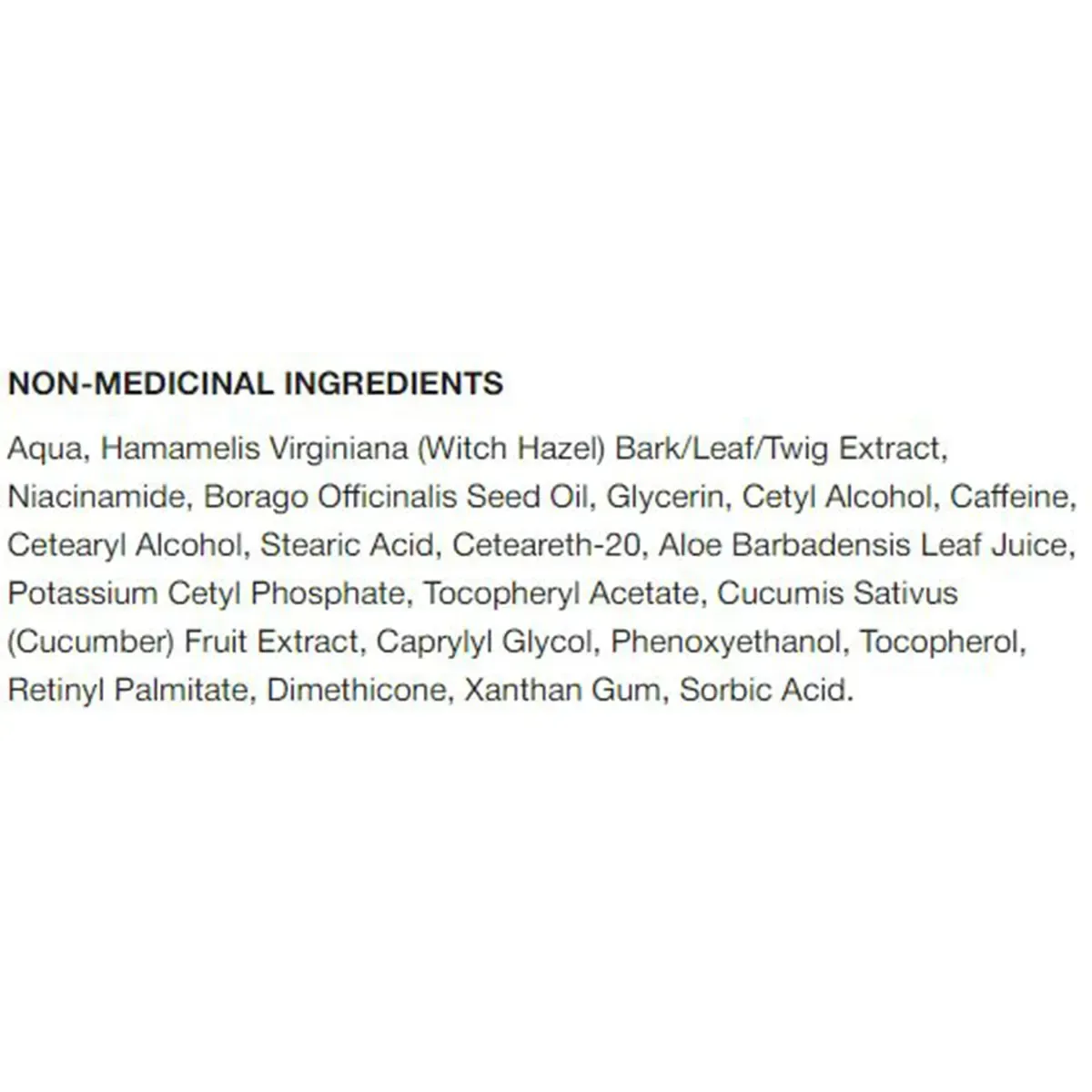 Water Aqua, Hamamelis Virginiana (Witch Hazel) Bark/Leaf/Twig Extract, Niacinamide, Borago Officinalis Seed Oil, Glycerin, Cetyl Alcohol, Caffeine, Cetearyl Alcohol, Stearic Acid, Ceteareth-20, Aloe Barbadensis Leaf Juice, Potassium Cetyl Phosphate, Tocopheryl Acetate, Cucumis Sativus (Cucumber) Fruit Extract, Caprylyl Glycol, Phenoxyethanol, Tocopherol, Retinyl Palmitate, Dimethicone, Xanthan Gum, Sorbic Acid.