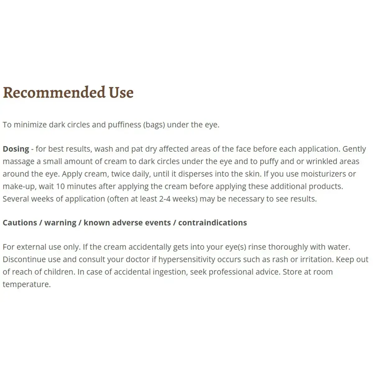 Dosing - for best results, wash and pat dry affected areas of the face before each application. Gently massage a small amount of cream to dark circles under the eye and to puffy and or wrinkled areas around the eye. Apply cream, twice daily, until it disperses into the skin. If you use moisturizers or make-up, wait 10 minutes after applying the cream before applying these additional products. Several weeks of application (often at least 2-4 weeks) may be necessary to see results.