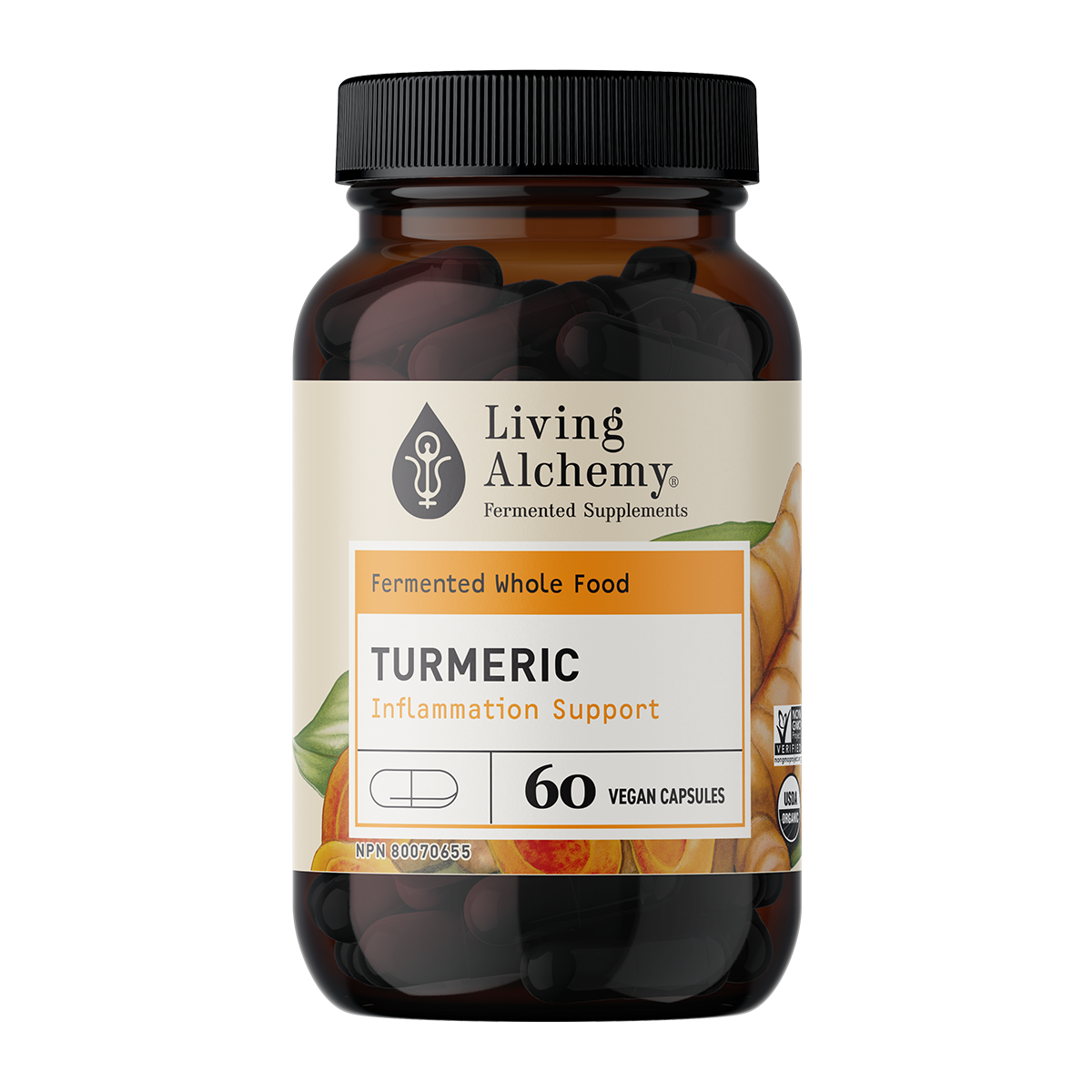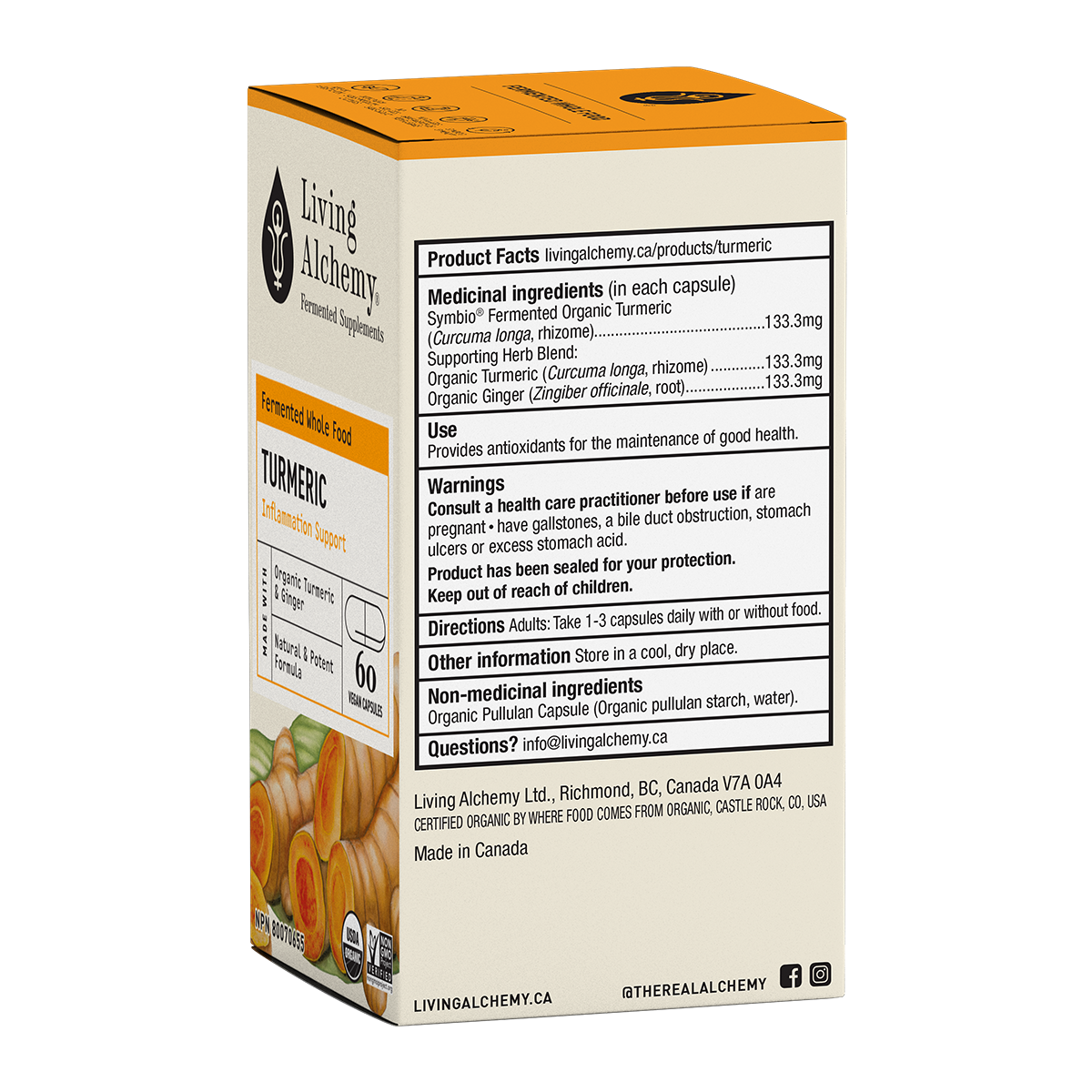 Compared to non-fermented turmeric, the Symbio fermented herb has approximately 983% more tetrahydro-curcumin, an anti-inflammatory bioactive compound.