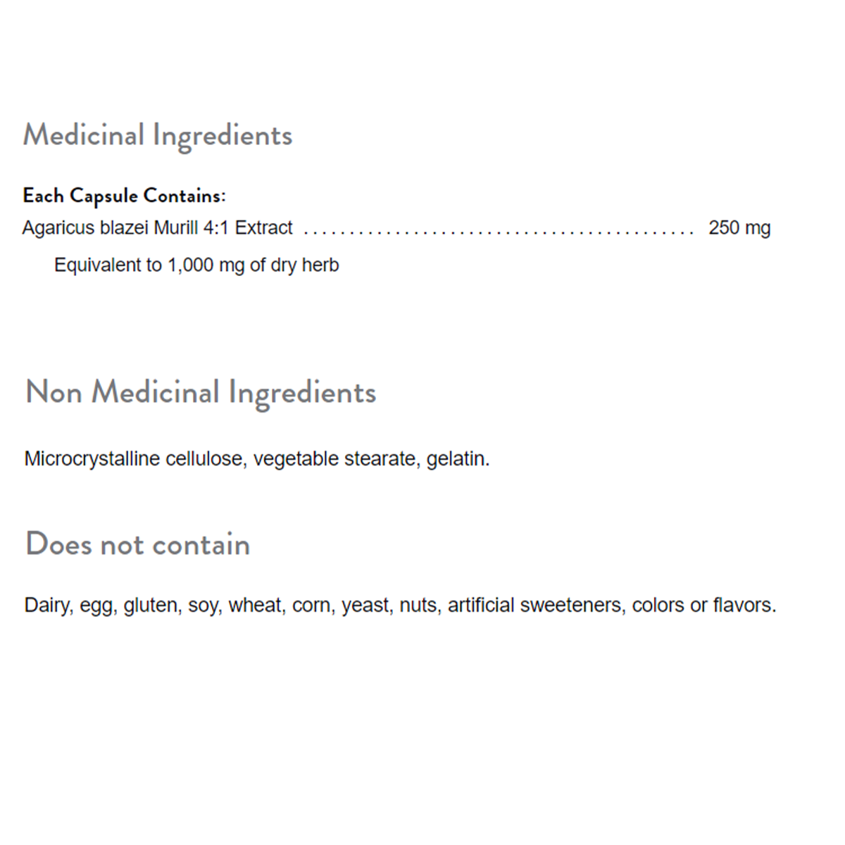 Agaricus blazei (Murill) is a medicinal mushroom, indigenous to the Brazilian rainforest, and has been used in traditional medicine for hundreds of years. Agaricus blazei is rich in immune-modulating polysaccharides and beta-glucans.