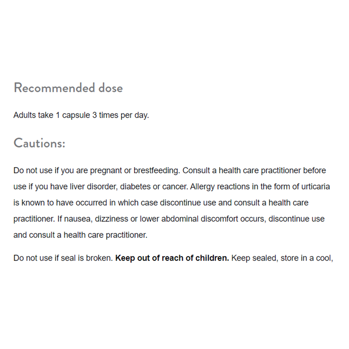 Do not use if you are pregnant or brestfeeding. Consult a health Wellness-Care practitioner before use if you have liver disorder, diabetes or cancer. Allergy reactions in the form of urticaria is known to have occurred in which case discontinue use and consult a health Wellness-Care practitioner. If nausea, dizziness or lower abdominal discomfort occurs, discontinue use and consult a health Wellness-Care practitioner.
