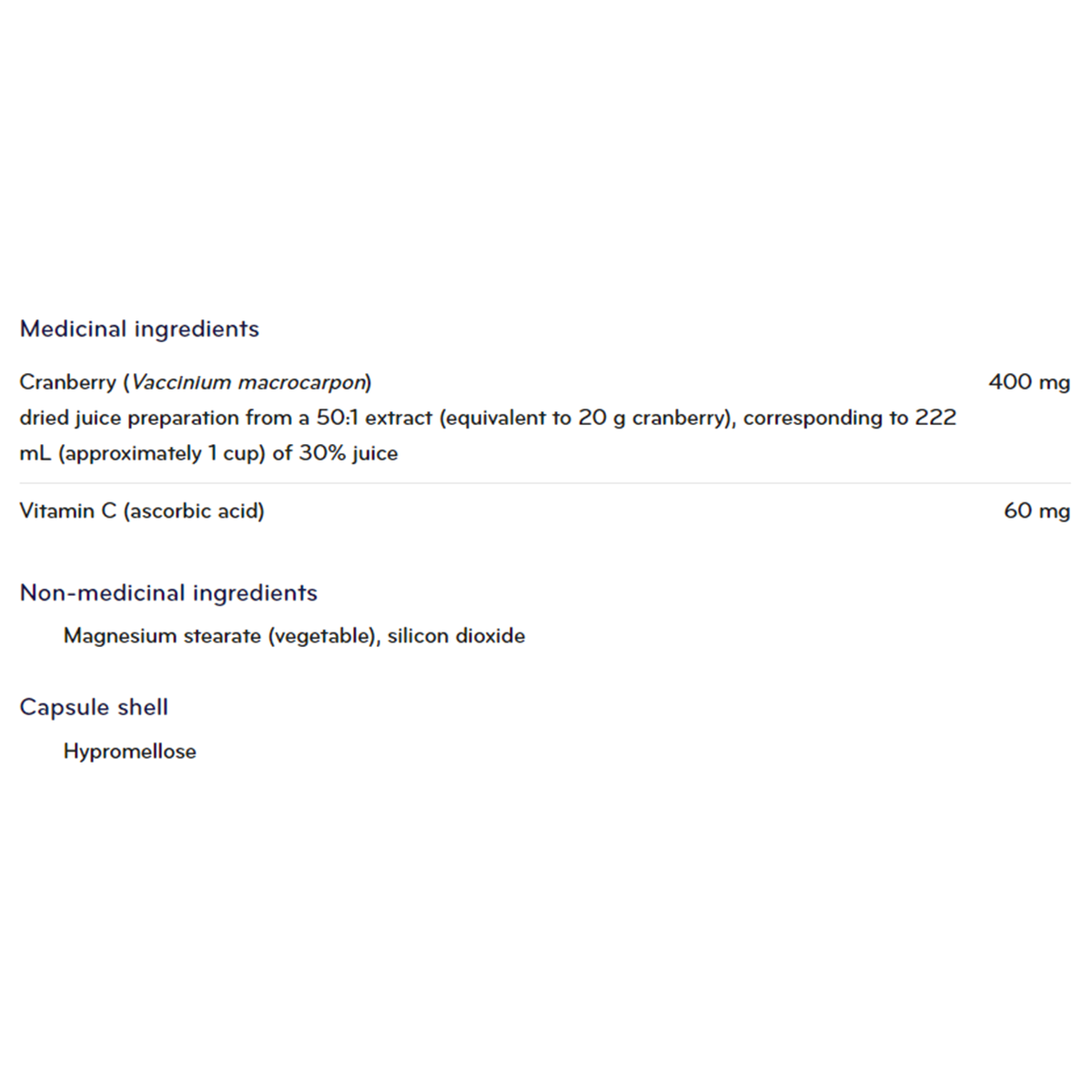 Cranberry (Vaccinium macrocarpon) dried juice preparation from a 50:1 extract (equivalent to 20 g cranberry), corresponding to 222 mL (approximately 1 cup) of 30% juice