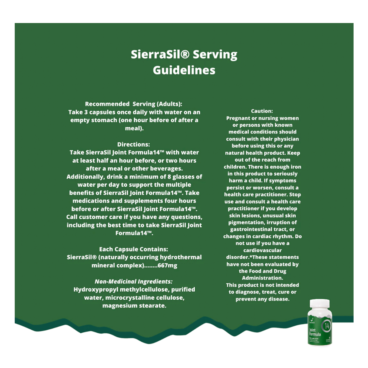 Start feeling better in 14 days or less. SierraSil Joint Formula14 contains SierraSil, a pure mineral powder with essential minerals including calcium, iron, silicon, potassium, magnesium, manganese, copper and zinc. Research shows SierraSil Joint Formula14 supports joint, cartilage and muscle function.* SierraSil Joint Formula 14 also supports gentle detoxification because of its clay mineral structure.*