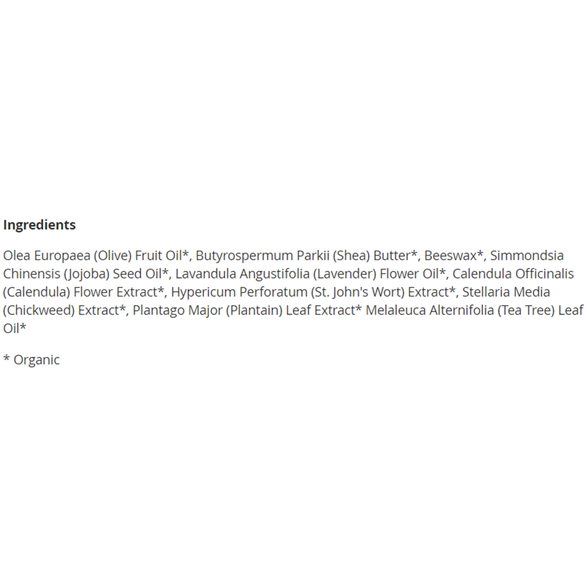 Olea Europaea (Olive) Fruit Oil*, Butyrospermum Parkii (Shea) Butter*, Beeswax*, Simmondsia Chinensis (Jojoba) Seed Oil*, Lavandula Angustifolia (Lavender) Flower Oil*, Calendula Officinalis (Calendula) Flower Extract*, Hypericum Perforatum (St. John's Wort) Extract*, Stellaria Media (Chickweed) Extract*, Plantago Major (Plantain) Leaf Extract* Melaleuca Alternifolia (Tea Tree) Leaf Oil*