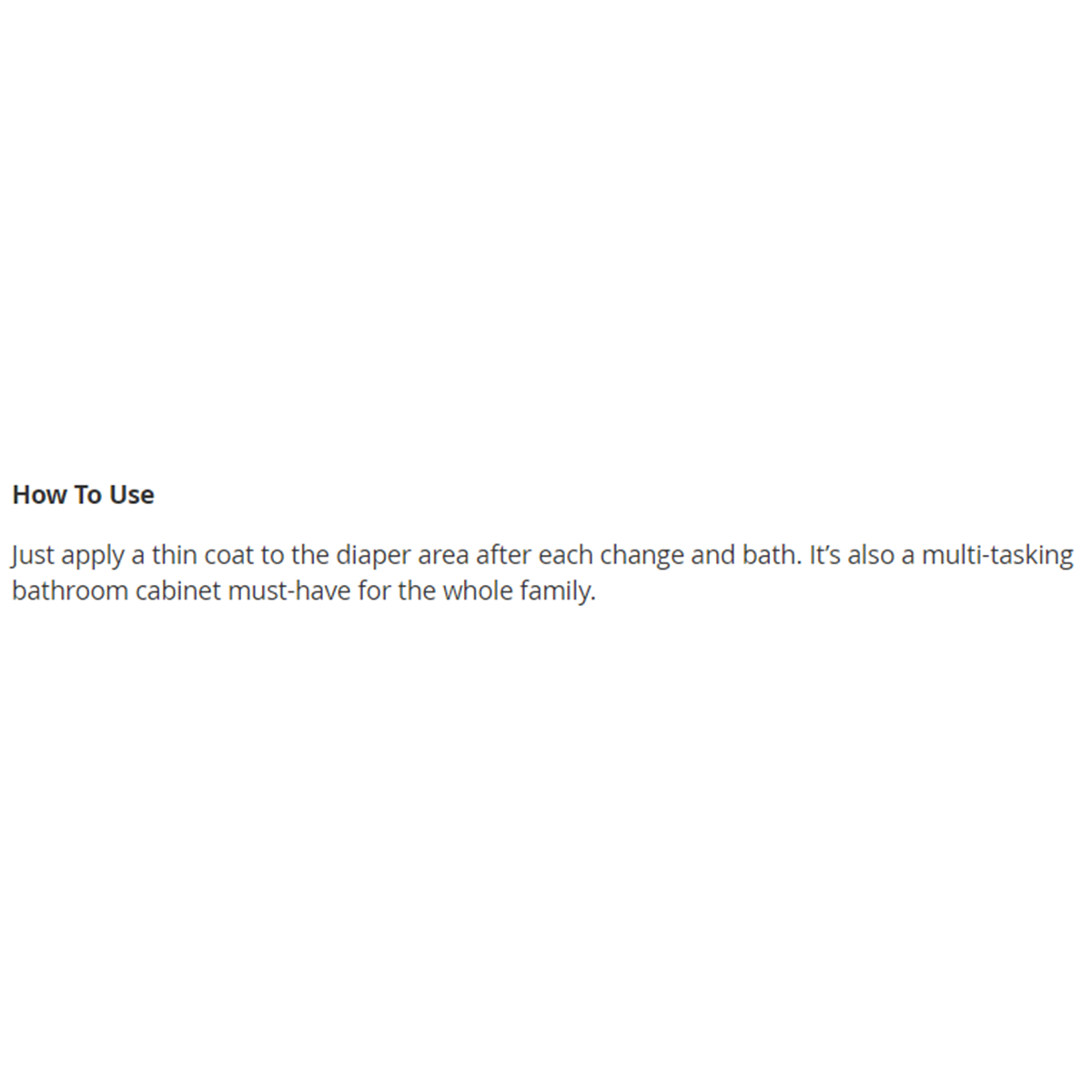 Just apply a thin coat to the diaper area after each change and bath. It’s also a multi-tasking bathroom cabinet must-have for the whole family.