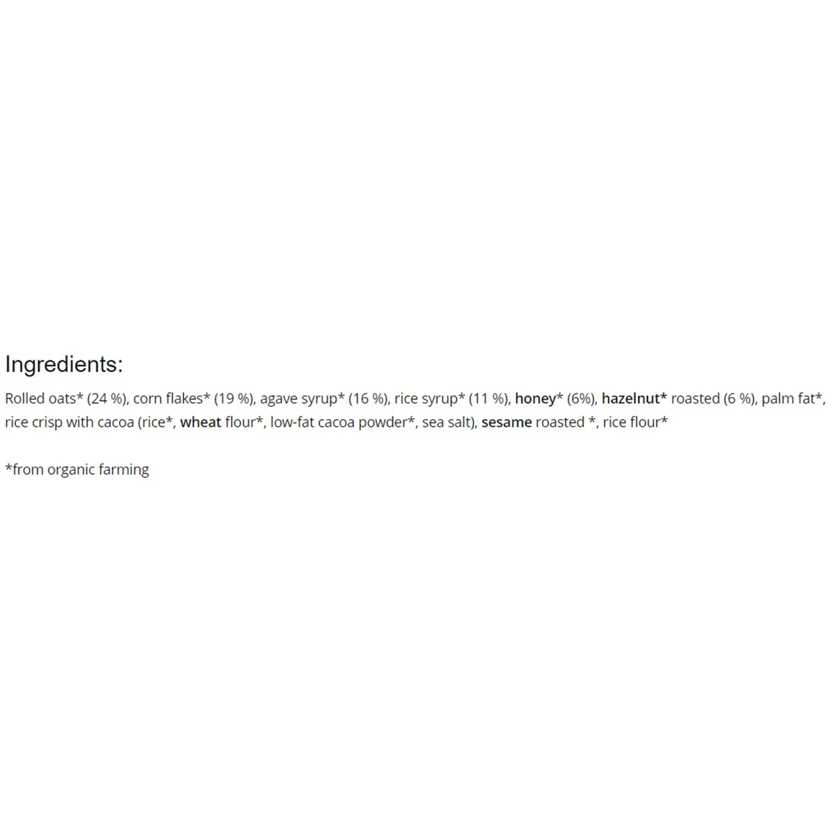 Rolled oats* (24 %), corn flakes* (19 %), agave syrup* (16 %), rice syrup* (11 %), honey* (6%), hazelnut* roasted (6 %), palm fat*, rice crisp with cacoa (rice*, wheat flour*, low-fat cacoa powder*, sea salt), sesame roasted , rice flour.