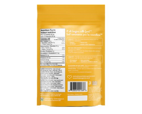 Enriched wheat flour*, Graham flour*, Sugars (cane sugar*, invert cane sugar syrup*, honey*), Palm oil* (sustainable), Flavours*, Sea salt, Sodium bicarbonate, Ammonium bicarbonate, Soy lecithin*, Apple powder*, Banana powder*, Sweet potato powder*, Broccoli powder*, Spinach powder*, Rice flour*. *Organic.