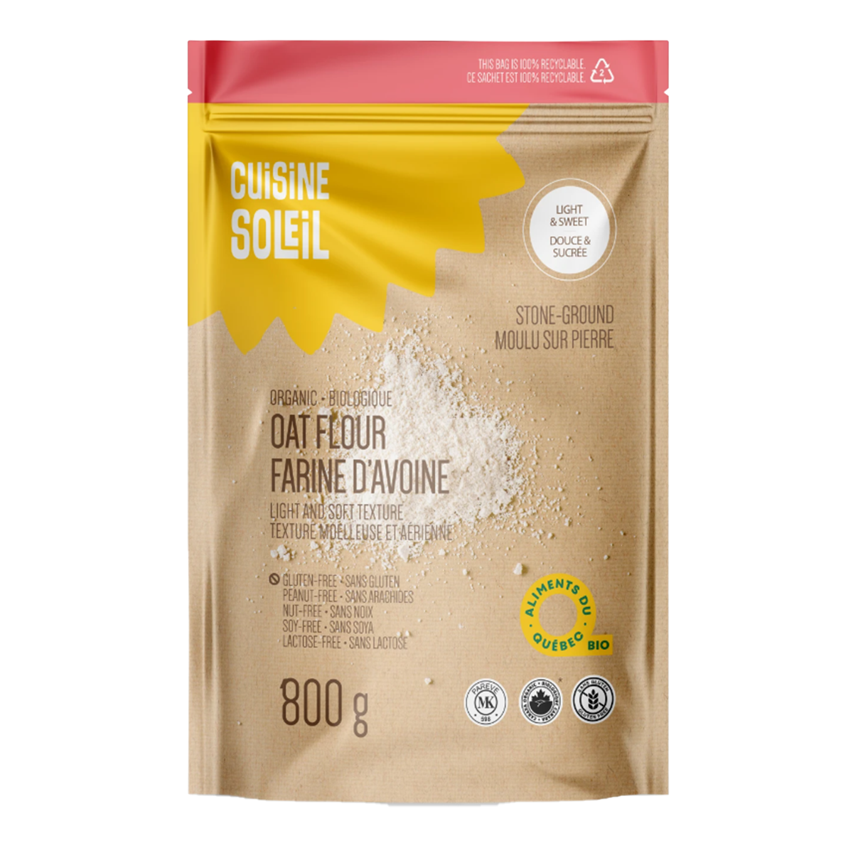 I'm so glad I discovered this oat flour—it's organic, gluten-free, soy-free, and nut-free, making it a versatile and healthy choice for baking.