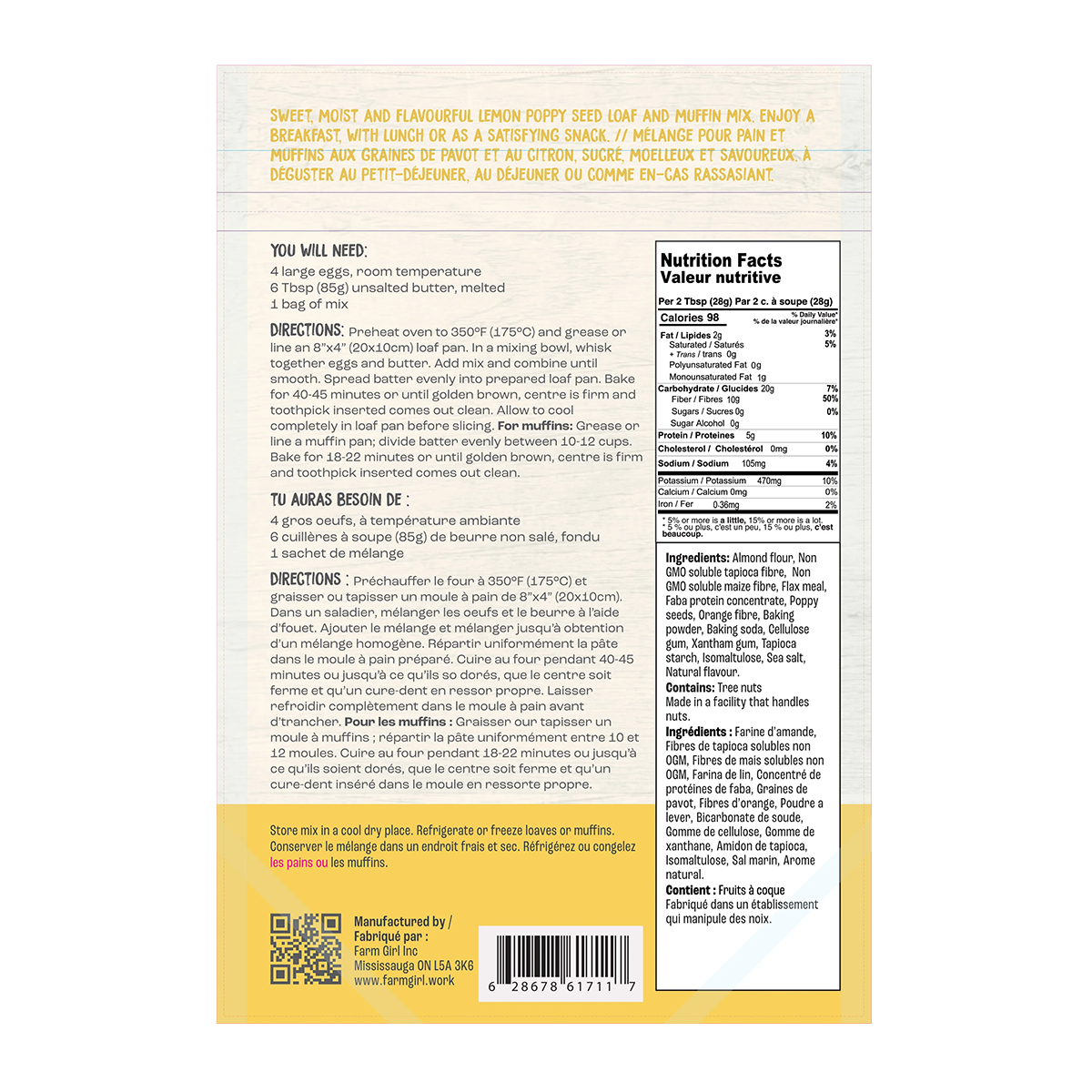 Almond Flour, Coconut Flour, Farm Girl Sugar Replacer, (Non GMO solable corn fiber, erythritol, Fructooligosaccharides, insulin, stevia), Flax Meal, Faba Protein Concentrate, Poppy Seeds, Orange Fiber, Baking Powder, Baking Soda, Cellulose Gum, Xanthan Gum, Tapioca Starch, Sea Salt, Natural Flavours.