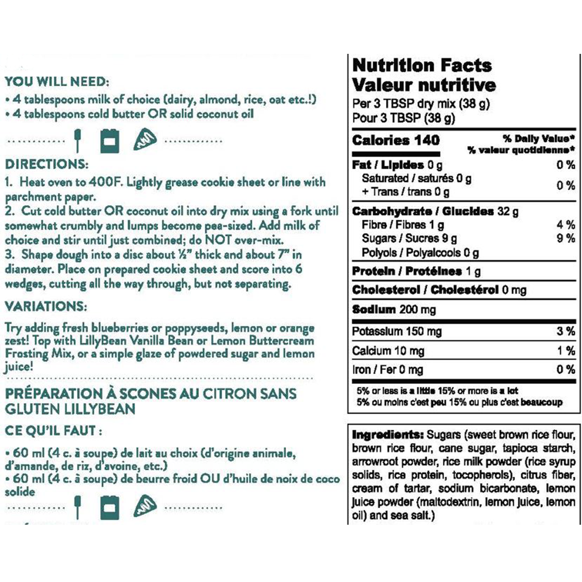 Sugars (sweet brown rice flour, brown rice flour, cane sugar, tapioca starch, arrowroot powder, rice milk powder (rice syrup solids, rice protein, tocopherols), citrus fiber, cream of tartar, sodium bicarbonate, lemon Juice powder (maltodextrin, lemon Juice, lemon oil) and sea salt.)