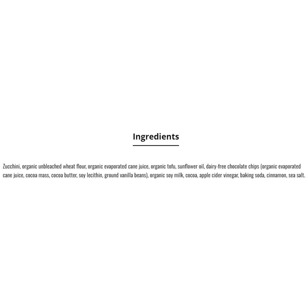 Zucchini, organic unbleached wheat flour, organic evaporated cane juice, organic tofu, sunflower oil, dairy-free chocolate chips (organic evaporated cane juice, cocoa mass, cocoa butter, soy lecithin, ground vanilla beans), organic soy milk, cocoa, apple cider vinegar, baking soda, cinnamon, sea salt.