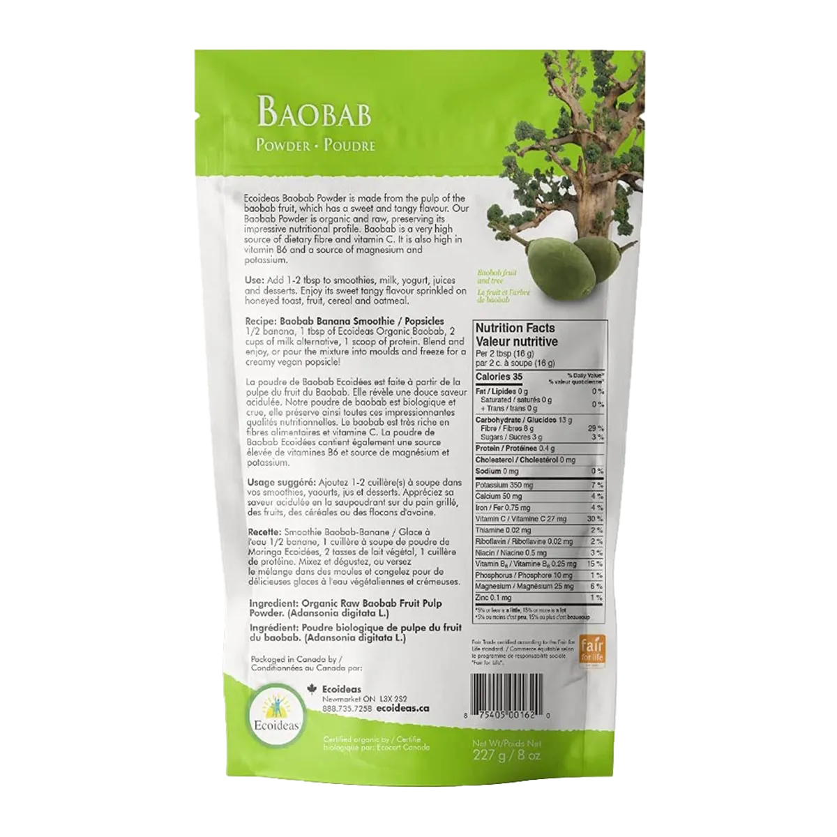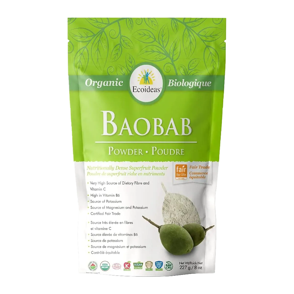 This Baobab Powder is organic and raw, maintaining its rich nutritional profile. Baobab is an excellent source of dietary fiber and vitamin C, while also being rich in potassium. Additionally, it provides vitamin B1 (thiamine), vitamin B6 (pyridoxine), magnesium, and manganese.