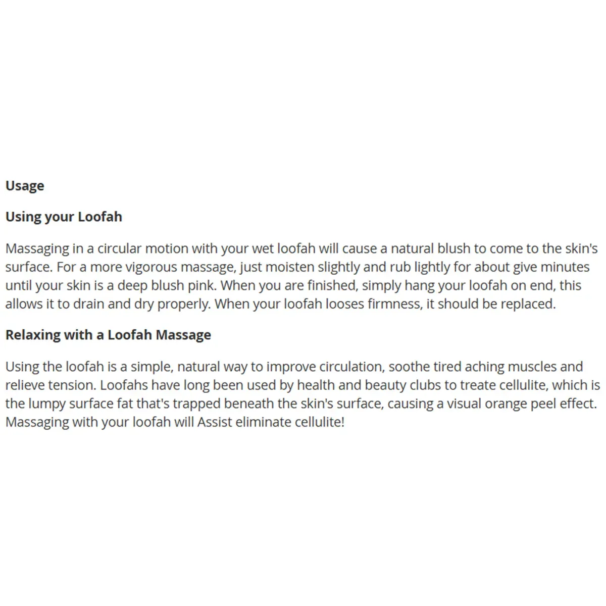 Massaging in a circular motion with your wet loofah will cause a natural blush to come to the skin's surface. For a more vigorous massage, just moisten slightly and rub lightly for about give minutes until your skin is a deep blush pink. When you are finished, simply hang your loofah on end, this allows it to drain and dry properly. When your loofah looses firmness, it should be replaced.