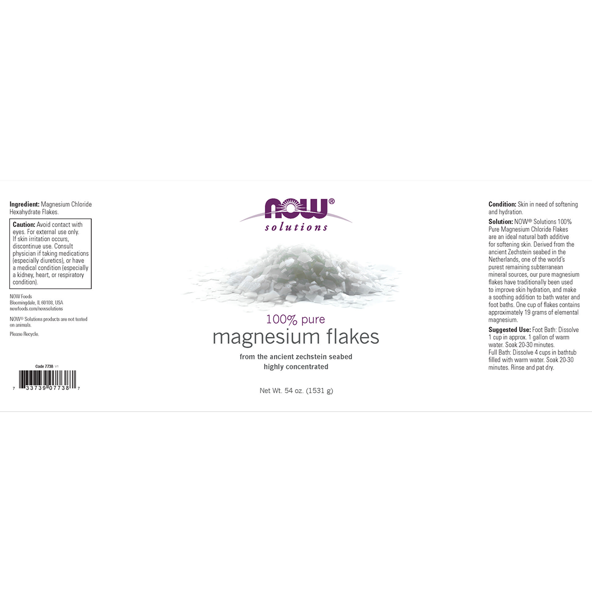 Solution: NOW Solutions 100% Pure Magnesium Chloride Flakes are an ideal natural bath additive for softening skin. Derived from the ancient Zechstein seabed in the Netherlands, one of the world’s purest remaining subterranean mineral sources, our pure magnesium flakes have traditionally been used to improve skin hydration, and make a soothing addition to bath water and foot baths. One cup of flakes contains approximately 19 grams of elemental magnesium.