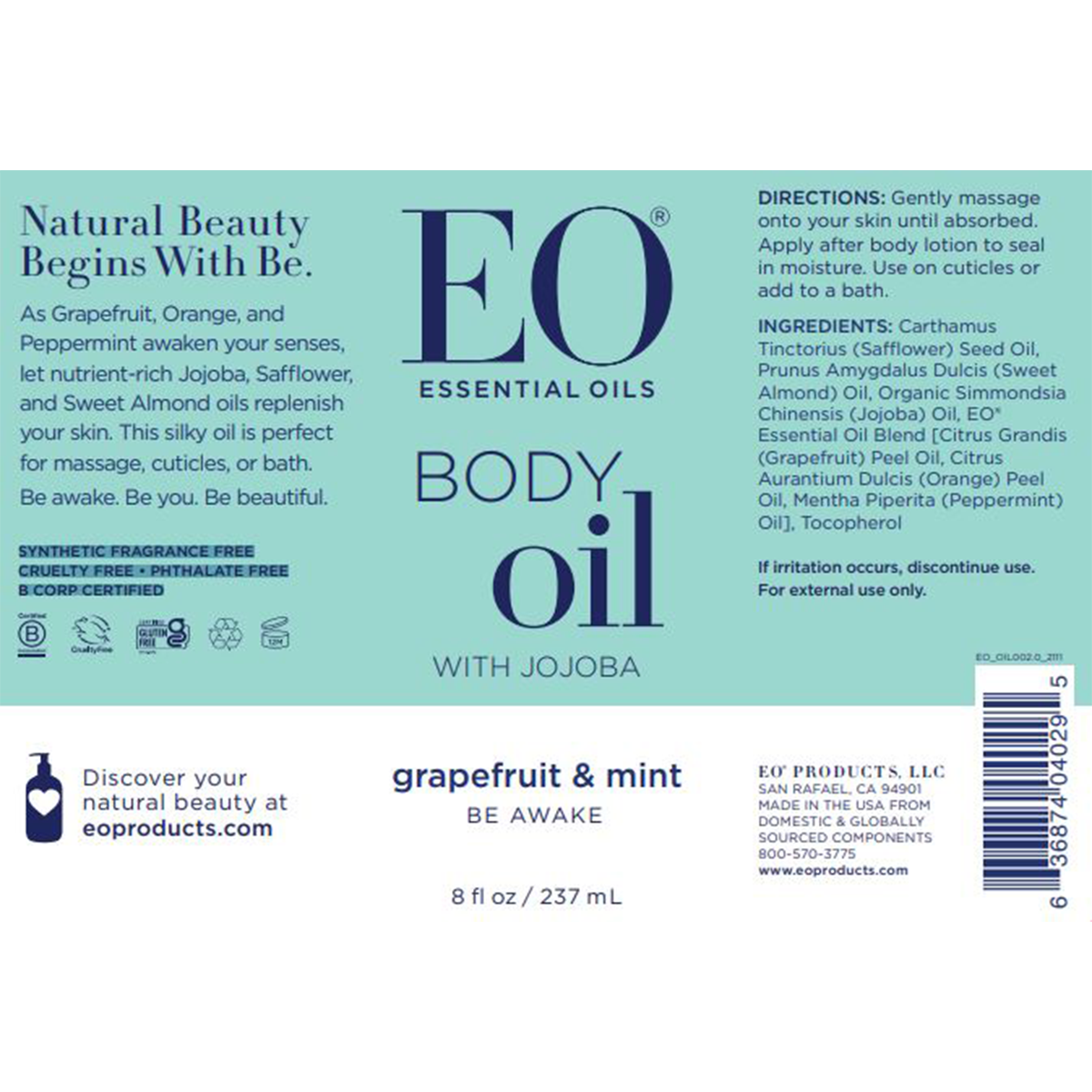 EO Products Body Oil With Jojoba Grapefruit And Mint 237mL
