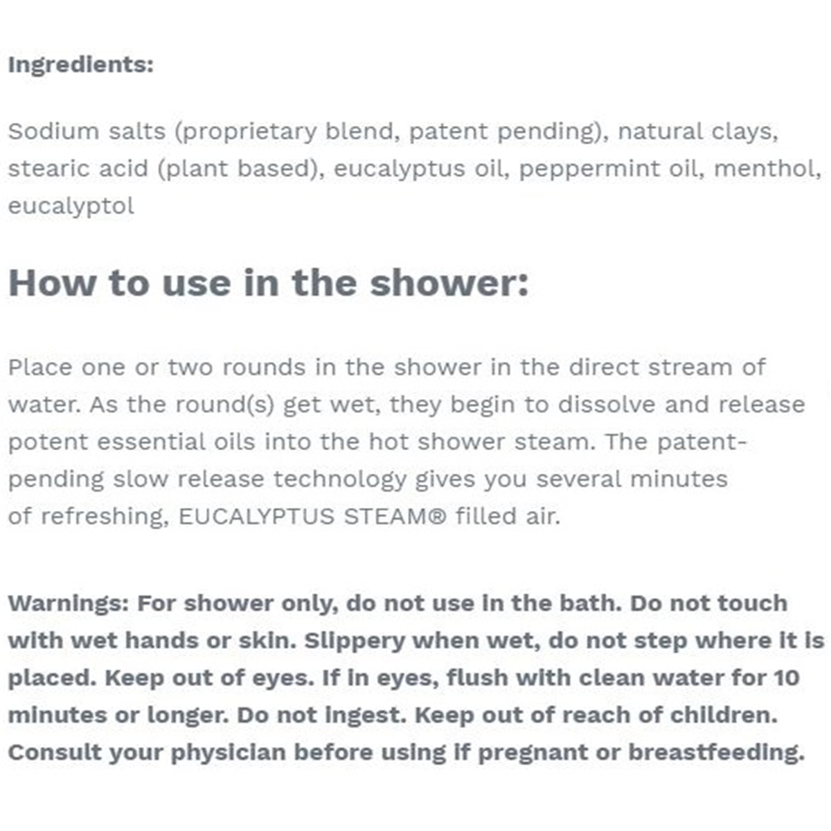 Place one or two rounds in the shower in the direct stream of water. As the round(s) get wet, they begin to dissolve and release potent essential oils into the hot shower steam. The patent-pending slow-release technology gives you several minutes of refreshing, EUCALYPTUS STEAM-filled air.