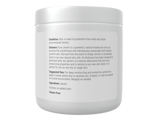 Solution: 100% Pure Lanolin is a powerful, natural moisturizer that can promote the smoothness and translucency associated with healthy, youthful looking skin. Derived from the wool of sheep, lanolin is remarkably close to our own natural skin oils and has a texture that is similar to petroleum jelly. It is perfect for use on very dry, rough or chapped skin. NOW Solutions Pure Lanolin is solid in its natural state.