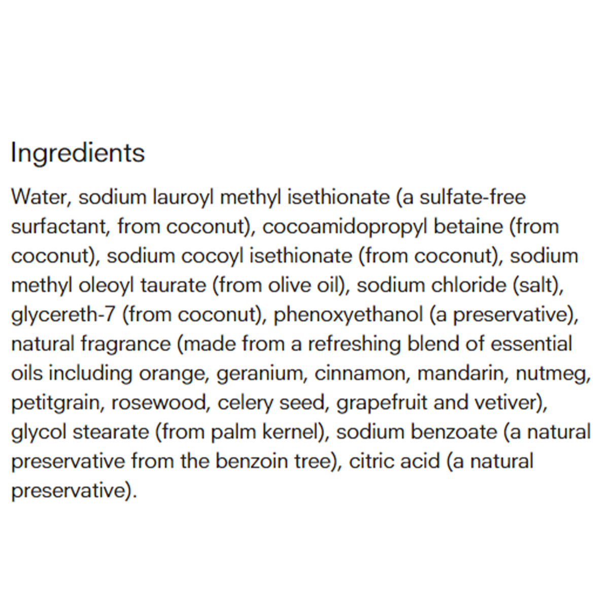 Water, sodium lauroyl methyl isethionate (a sulfate-free surfactant, from coconut), cocoamidopropyl betaine (from coconut), sodium cocoyl isethionate (from coconut), sodium methyl oleoyl taurate (from olive oil), sodium chloride (salt), glycereth-7 (from coconut), phenoxyethanol (a preservative), natural fragrance (made from a refreshing blend of essential oils including orange, geranium, cinnamon, mandarin, nutmeg, petitgrain, rosewood, celery seed, grapefruit and vetiver), glycol stearate (from palm kernel), sodium benzoate (a natural preservative from the benzoin tree), citric acid (a natural preservative).