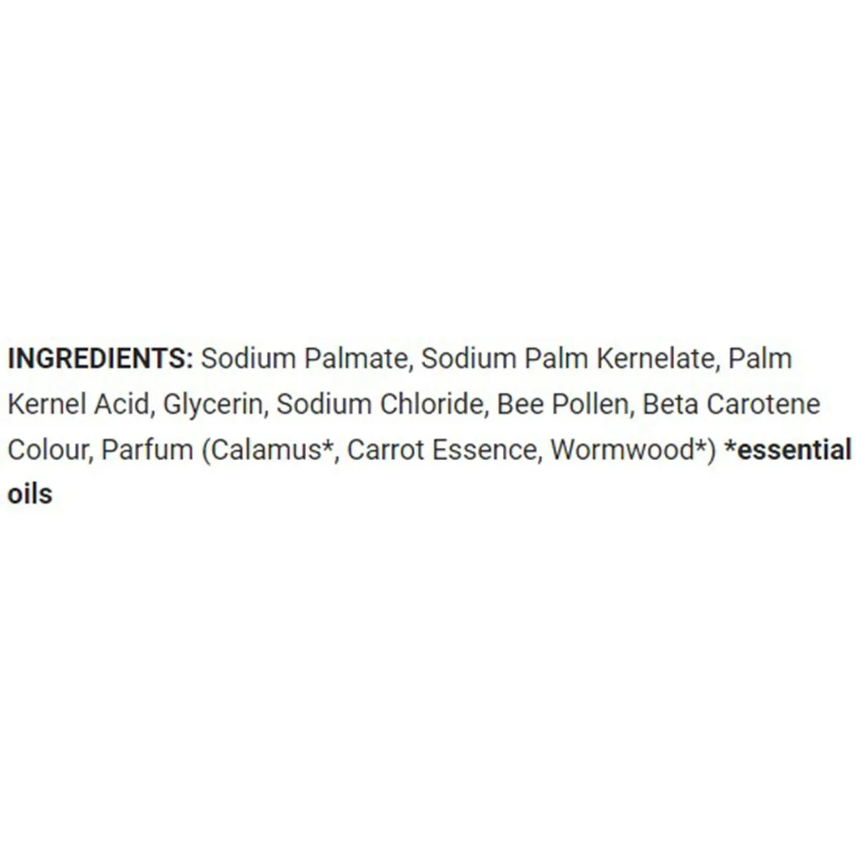 Sodium Palmate, Sodium Palm Kernelate, Palm Kernel Acid, Glycerin, Sodium Chloride, Bee Pollen, Beta Carotene Color, Parfum (Calamus*, Carrot Essence, Wormwood*) *essential oils