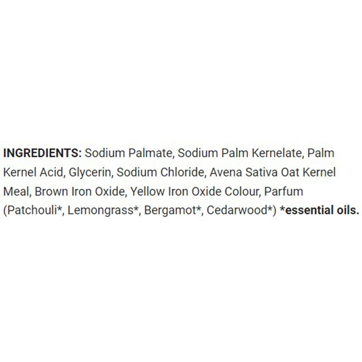 Sodium Palmate, Sodium Palm Kernelate, Palm Kernel Acid, Glycerin, Sodium Chloride, Avena Sativa Oat Kernel Meal, Brown Iron Oxide, Yellow Iron Oxide Colour, Parfum (Patchouli, Lemongrass*, Bergamot*, Cedarwood*) *essential oils.