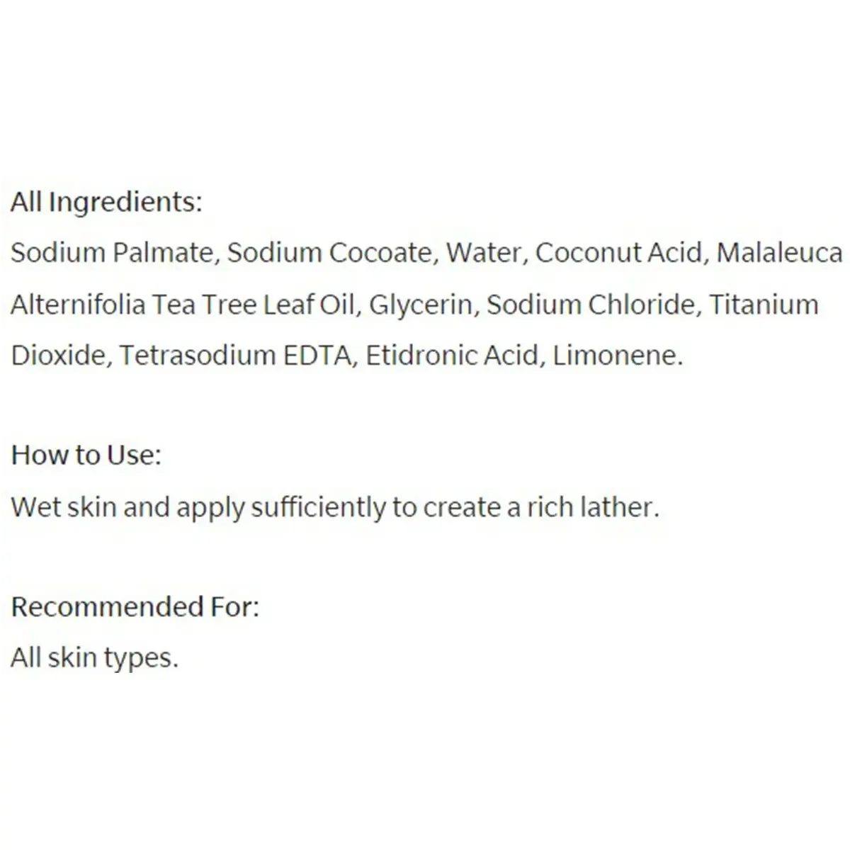 Sodium Palmate, Sodium Cocoate, Water, Coconut Acid, Malaleuca Alternifolia Tea Tree Leaf Oil, Glycerin, Sodium Chloride, Titanium Dioxide, Tetrasodium EDTA, Etidronic Acid, Limonene.