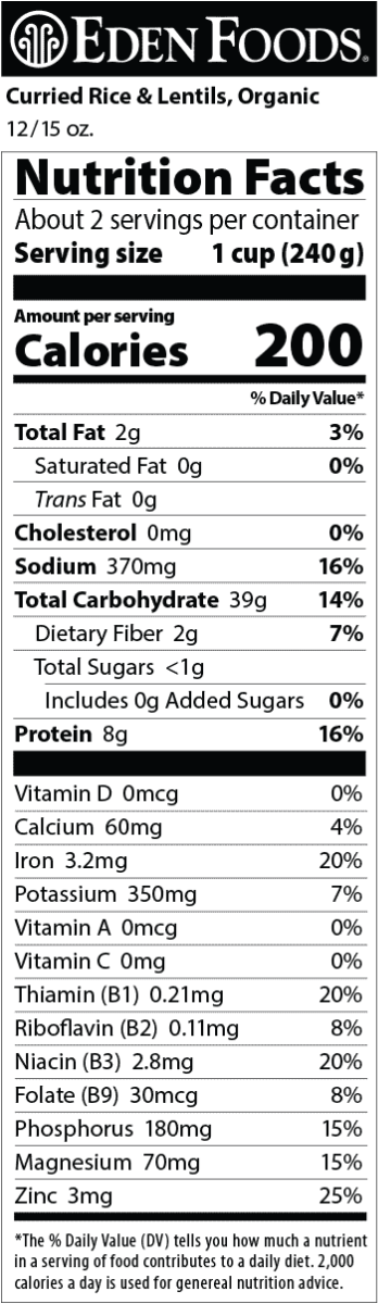 A treasured turmeric curry, Lundberg short grain brown rice, and organic family green lentils seasoned with EDEN organic spices, and a bit of EDEN Sea Salt. Expertly cooked at Eden’s organic cannery. Whole grain and beans together deliver complete protein. A no-compromise time saver. Use for quick samosa (stuffed, fried Indian pastry), soup, stew, or simply heat, stir, and serve. Rich folate B9, low fat, good iron, thiamin B1, magnesium, and zinc. Gluten free. BPA, BPS, and phthalate free cans since 1999.