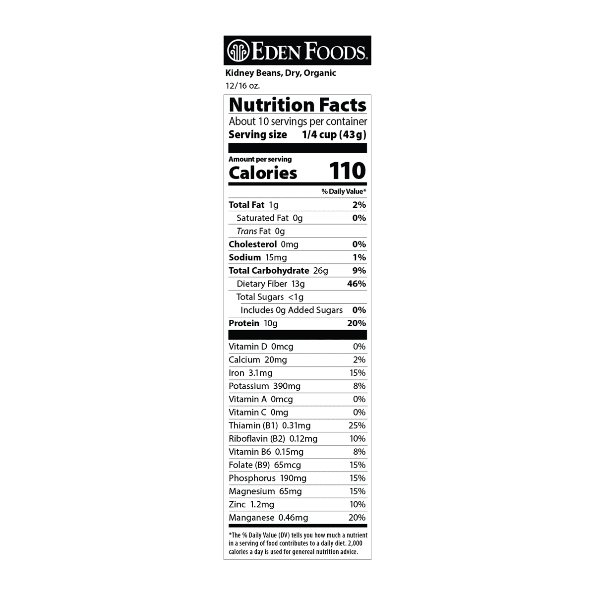 Organic EDEN Dark Red Kidney beans are USA grown. They have a rich, appealing taste and large amounts of antioxidant carotenoids that make up their deep color. They are protein rich and are the chili bean. A good soup bean because kidney beans have thicker skin, and they hold up very well in soup and stew. Kidney beans and more than 500 beans related to it, including pinto, navy, and great northern, black, are known as ‘common beans’ because they came from a common bean ancestor. Common beans, squash, and corn were called the ‘Three Sisters’ by Native Americans; companion plants that were central in Native American cultures. Packed in one of the most environmentally friendly packages there is, organic EDEN Dark Red Dry Kidney Beans come in 1 lb. boxes of recycled and recyclable paperboard.