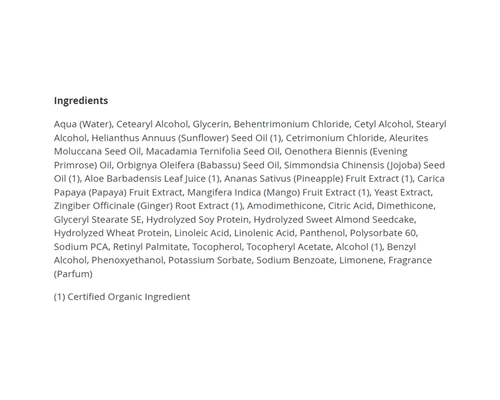 Aqua (Water), Cetearyl Alcohol, Glycerin, Behentrimonium Chloride, Cetyl Alcohol, Stearyl Alcohol, Helianthus Annuus (Sunflower) Seed Oil (1), Cetrimonium Chloride, Aleurites Moluccana Seed Oil, Macadamia Ternifolia Seed Oil, Oenothera Biennis (Evening Primrose) Oil, Orbignya Oleifera (Babassu) Seed Oil, Simmondsia Chinensis (Jojoba) Seed Oil (1), Aloe Barbadensis Leaf Juice (1), Ananas Sativus (Pineapple) Fruit Extract (1), Carica Papaya (Papaya) Fruit Extract, Mangifera Indica (Mango) Fruit Extract (1), Yeast Extract, Zingiber Officinale (Ginger) Root Extract (1), Amodimethicone, Citric Acid, Dimethicone, Glyceryl Stearate SE, Hydrolyzed Soy Protein, Hydrolyzed Sweet Almond Seedcake, Hydrolyzed Wheat Protein, Linoleic Acid, Linolenic Acid, Panthenol, Polysorbate 60, Sodium PCA, Retinyl Palmitate, Tocopherol, Tocopheryl Acetate, Alcohol (1), Benzyl Alcohol, Phenoxyethanol, Potassium Sorbate, Sodium Benzoate, Limonene, Fragrance (Parfum) (1) Certified Organic Ingredient.