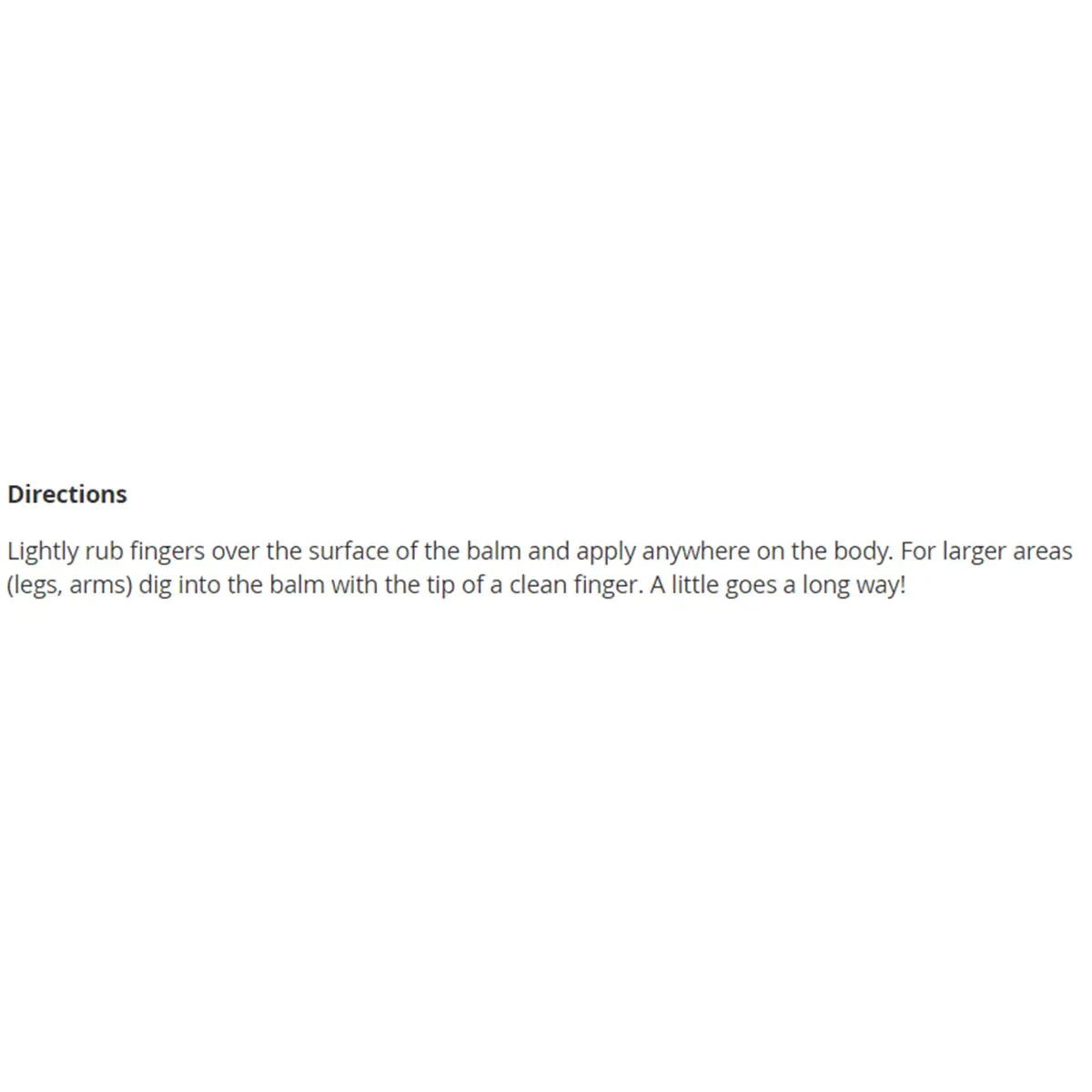 Lightly rub fingers over the surface of the balm and apply anywhere on the body. For larger areas (legs, arms) dig into the balm with the tip of a clean finger. A little goes a long way!