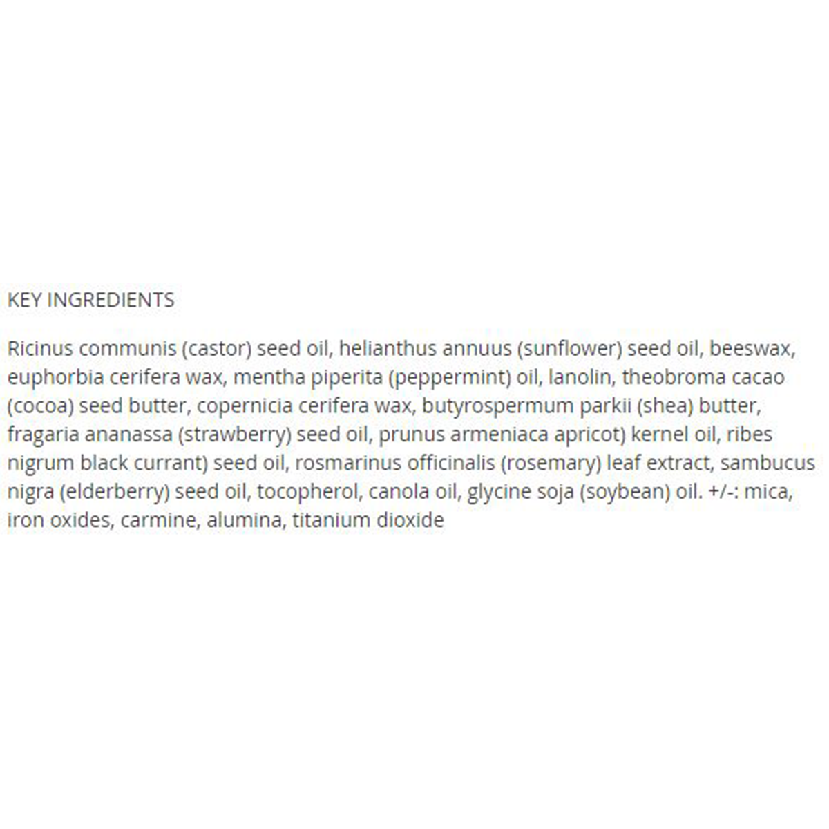 Ricinus communis (castor) seed oil, helianthus annuus (sunflower) seed oil, beeswax, euphorbia cerifera wax, mentha piperita (peppermint) oil, lanolin, theobroma cacao (cocoa) seed butter, copernicia cerifera wax, butyrospermum parkii (shea) butter, fragaria ananassa (strawberry) seed oil, prunus armeniaca apricot) kernel oil, ribes nigrum black currant) seed oil, rosmarinus officinalis (rosemary) leaf extract, sambucus nigra (elderberry) seed oil, tocopherol, canola oil, glycine soja (soybean) oil. +/-: mica, iron oxides, carmine, alumina, titanium dioxide.