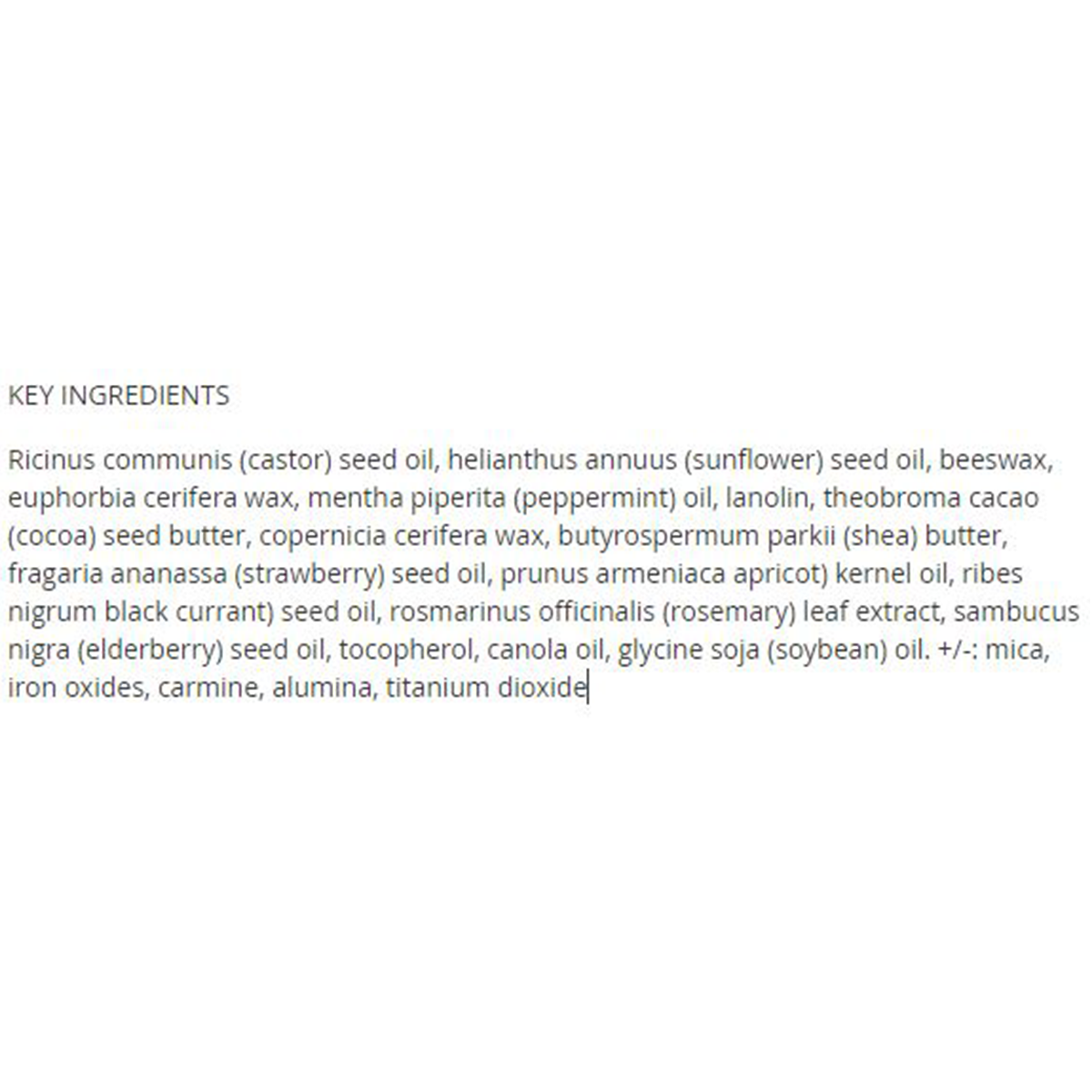Ricinus communis (castor) seed oil, helianthus annuus (sunflower) seed oil, beeswax, euphorbia cerifera wax, mentha piperita (peppermint) oil, lanolin, theobroma cacao (cocoa) seed butter, copernicia cerifera wax, butyrospermum parkii (shea) butter, fragaria ananassa (strawberry) seed oil, prunus armeniaca apricot) kernel oil, ribes nigrum black currant) seed oil, rosmarinus officinalis (rosemary) leaf extract, sambucus nigra (elderberry) seed oil, tocopherol, canola oil, glycine soja (soybean) oil. +/-: mica, iron oxides, carmine, alumina, titanium dioxide.