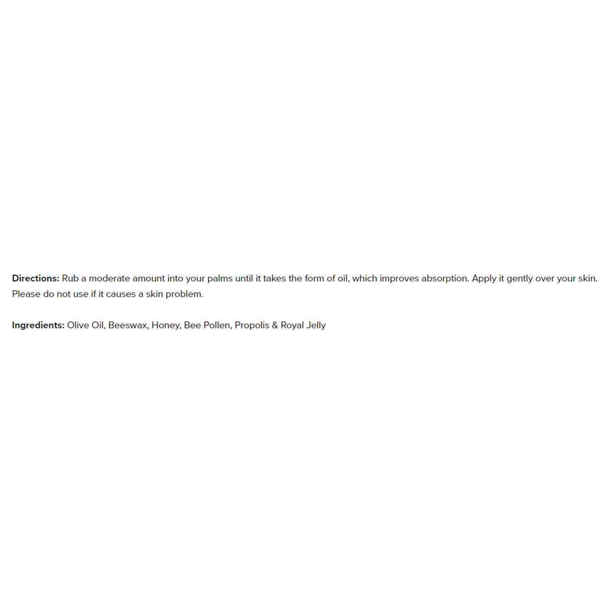 Olive Oil, Beeswax, Honey, Bee Pollen, Propolis & Royal Jelly.