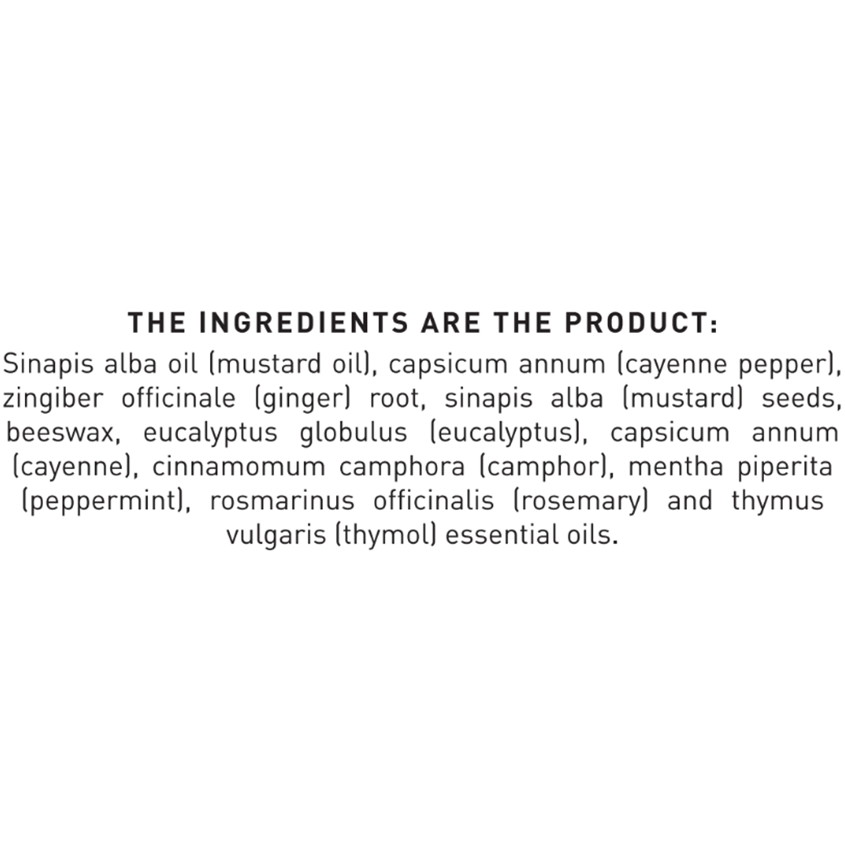 Sinapis alba oil (mustard oil), capsicum annum (cayenne pepper), zingiber officinale (ginger) root, sinapis alba (mustard) seeds, beeswax, eucalyptus globulus (eucalyptus), capsicum annum (cayenne), cinnamomum camphora (camphor), mentha piperita (peppermint), rosmarinus officinalis (rosemary) and thymus vulgaris (thymol) essential oils.