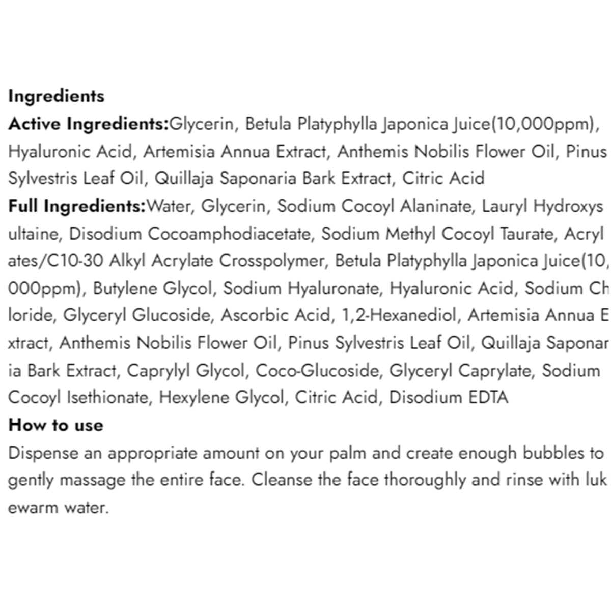 Water, Glycerin, Sodium Cocoyl Alaninate, Lauryl Hydroxysultaine, Disodium Cocoamphodiacetate, Sodium Methyl Cocoyl Taurate, Acrylates/C10-30 Alkyl Acrylate Crosspolymer, Betula Platyphylla Japonica Juice(10,000ppm), Butylene Glycol, Sodium Hyaluronate, Hyaluronic Acid, Sodium Chloride, Glyceryl Glucoside, Ascorbic Acid, 1,2-Hexanediol, Artemisia Annua Extract, Anthemis Nobilis Flower Oil, Pinus Sylvestris Leaf Oil, Quillaja Saponaria Bark Extract, Caprylyl Glycol, Coco-Glucoside, Glyceryl Caprylate, Sodium Cocoyl Isethionate, Hexylene Glycol, Citric Acid, Disodium EDTA.