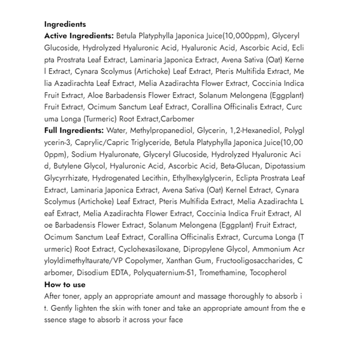 Betula Platyphylla Japonica Juice(10,000ppm), Glyceryl Glucoside, Hydrolyzed Hyaluronic Acid, Hyaluronic Acid, Ascorbic Acid, Eclipta Prostrata Leaf Extract, Laminaria Japonica Extract, Avena Sativa (Oat) Kernel Extract, Cynara Scolymus (Artichoke) Leaf Extract, Pteris Multifida Extract, Melia Azadirachta Leaf Extract, Melia Azadirachta Flower Extract, Coccinia Indica Fruit Extract, Aloe Barbadensis Flower Extract, Solanum Melongena (Eggplant) Fruit Extract, Ocimum Sanctum Leaf Extract, Corallina Officinalis Extract, Curcuma Longa (Turmeric) Root Extract,Carbomer.