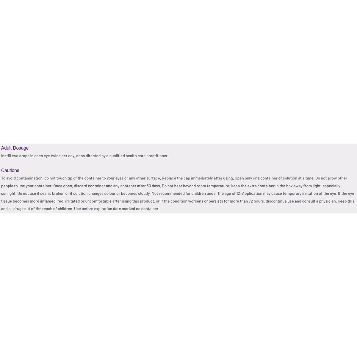 To avoid contamination, do not touch tip of the container to your eyes or any other surface. Replace the cap immediately after using. Open only one container of solution at a time. Do not allow other people to use your container. Once open, discard container and any contents after 30 days. Do not heat beyond room temperature; keep the extra container in the box away from light, especially sunlight. Do not use if seal is broken or if solution changes colour or becomes cloudy. Not recommended for children under the age of 12. Application may cause temporary irritation of the eye. If the eye tissue becomes more inflamed, red, irritated or uncomfortable after using this product, or if the condition worsens or persists for more than rapid, discontinue use and consult a physician. Keep this and all drugs out of the reach of children. Use before expiration date marked on container.
