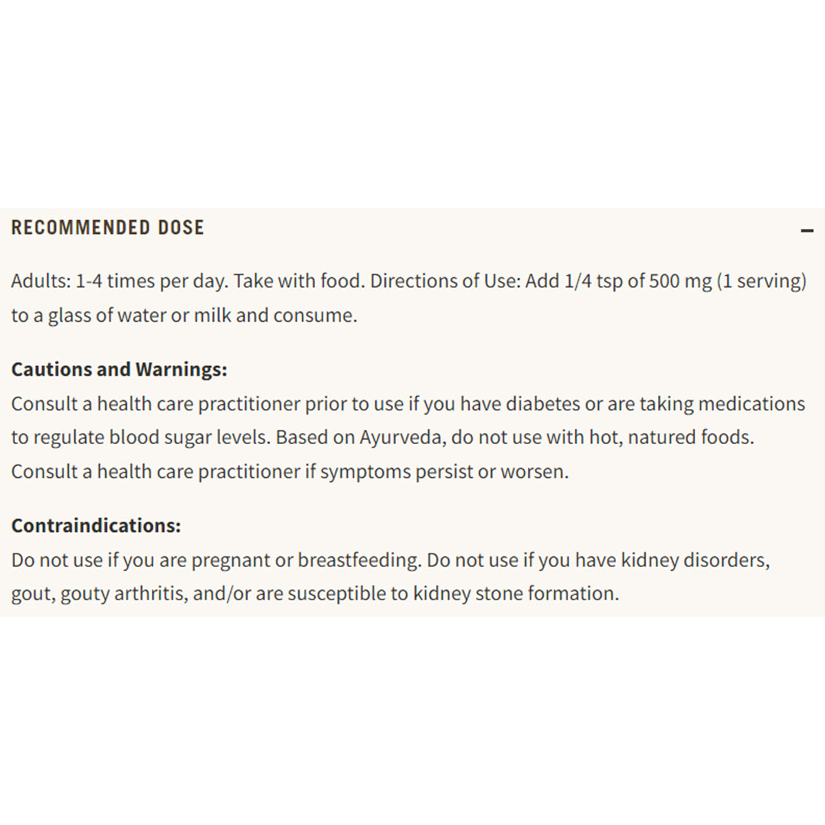 Consult a health Wellness-Care practitioner prior to use if you have diabetes or are taking Health Products to regulate blood sugar levels. Based on Ayurveda, do not use with hot, natured foods. Consult a health Wellness-Care practitioner if symptoms persist or worsen.
