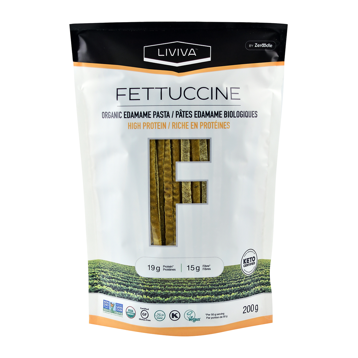 LIVIVA Organic Edamame Fettuccine is packed with high-quality plant-based protein, high in fiber, with no additives or preservatives. Carefully crafted and hand processed, our Edamame Fettuccine is made using only organic, non-GMO beans and water. Whether you’re looking for a low carb pasta, living a keto Nutrition Plan, or watching your weight, our LIVIVA Organic Edamame Fettuccine is a great pasta alternative
