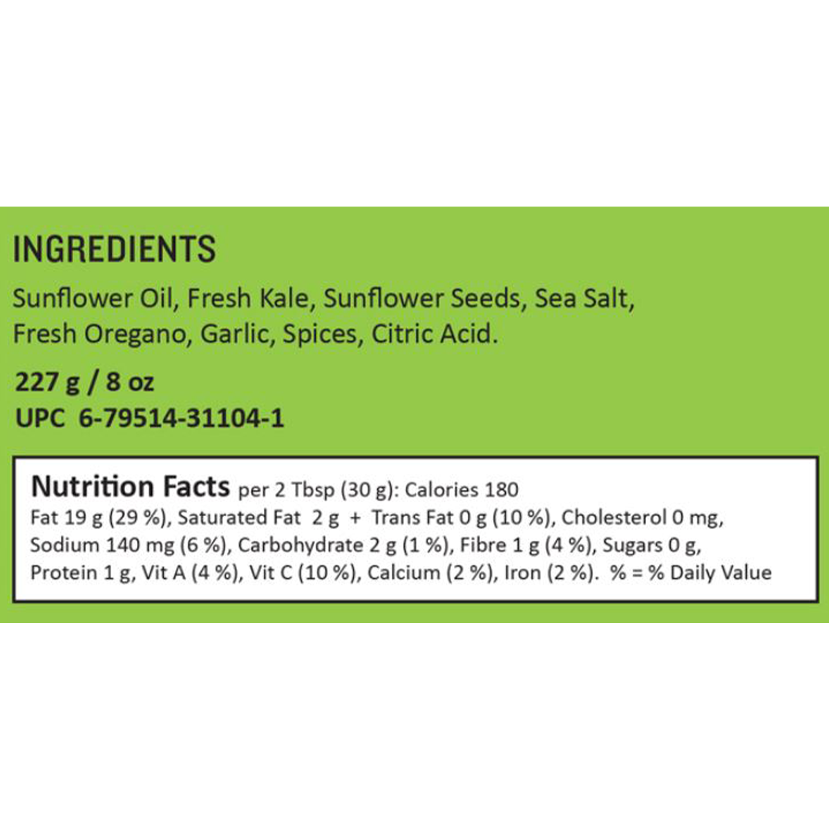 Sunflower Oil, Fresh Kale, Sunflower Seeds, Sea Salt, Fresh Oregano, Garlic, Spices, Citric Acid.