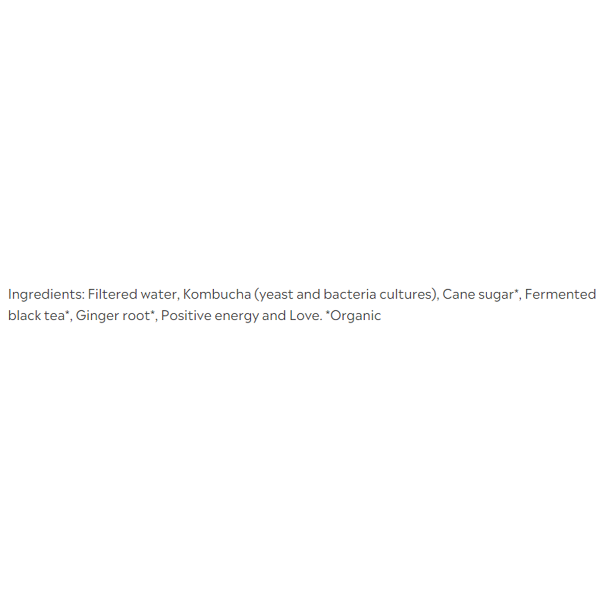 Filtered water, Kombucha (yeast and bacteria cultures), Cane sugar*, Fermented black tea*, Ginger root*, Positive energy and Love.