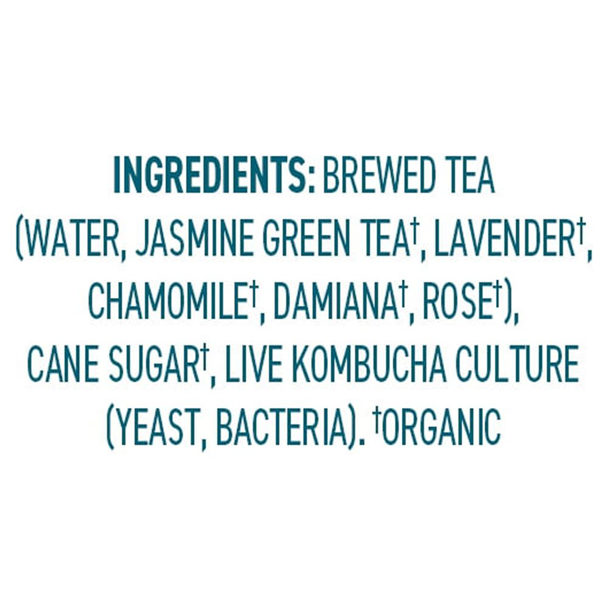Brewed Tea (Water, Jasmine Green Tea†, Lavender†, Chamomile†, Damiana†, Rose†), Cane Sugar†, Live Kombucha Culture (Yeast, Bacteria). †Organic