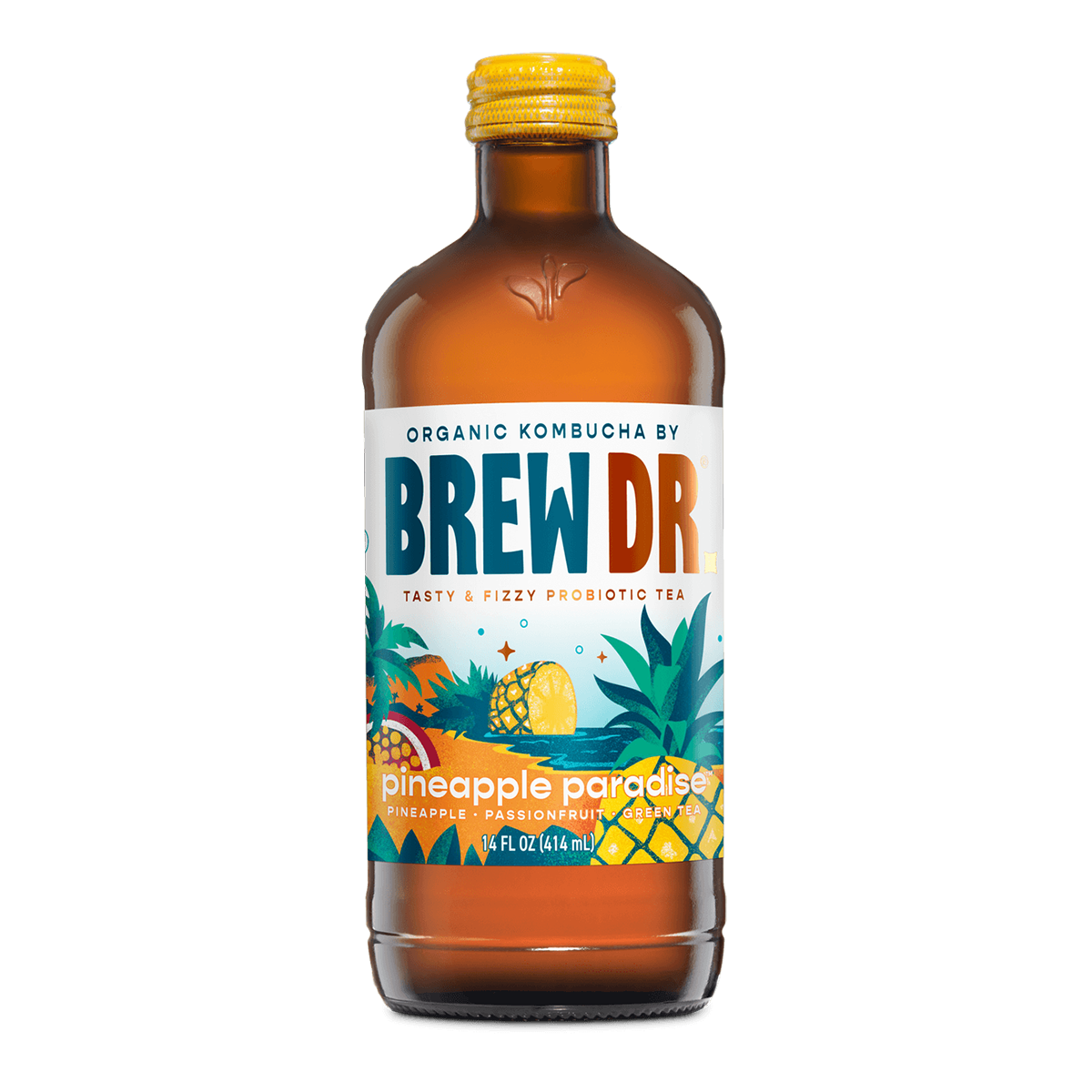 Brewed tea (water, green tea*), pineapple juice*, cane sugar*, lemon juice*, live kombucha culture (yeast, bacteria) guava puree*, passionfruit juice*. *Organic