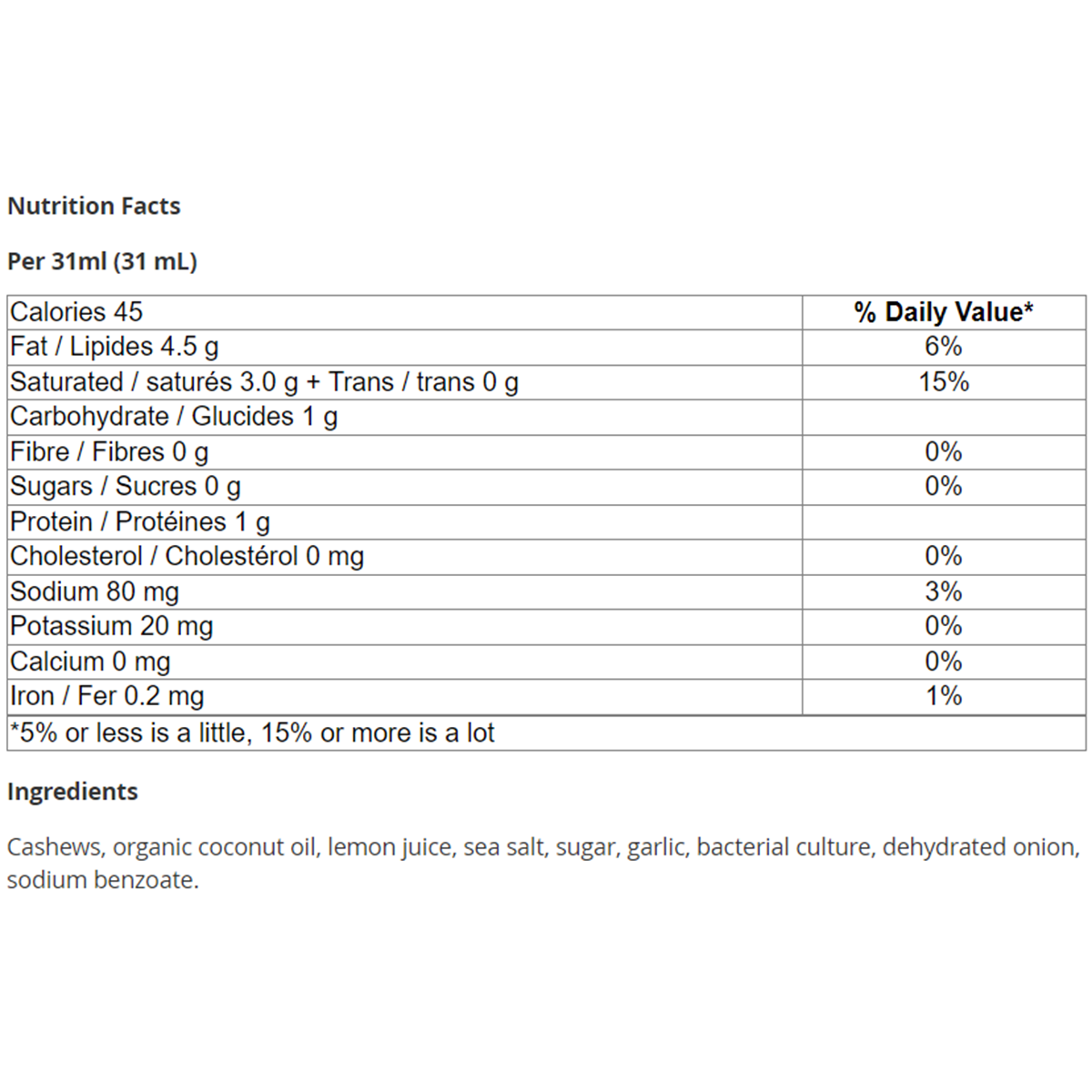 Cashews, organic coconut oil, lemon juice, sea salt, sugar, garlic, bacterial culture, dehydrated onion, sodium benzoate.
